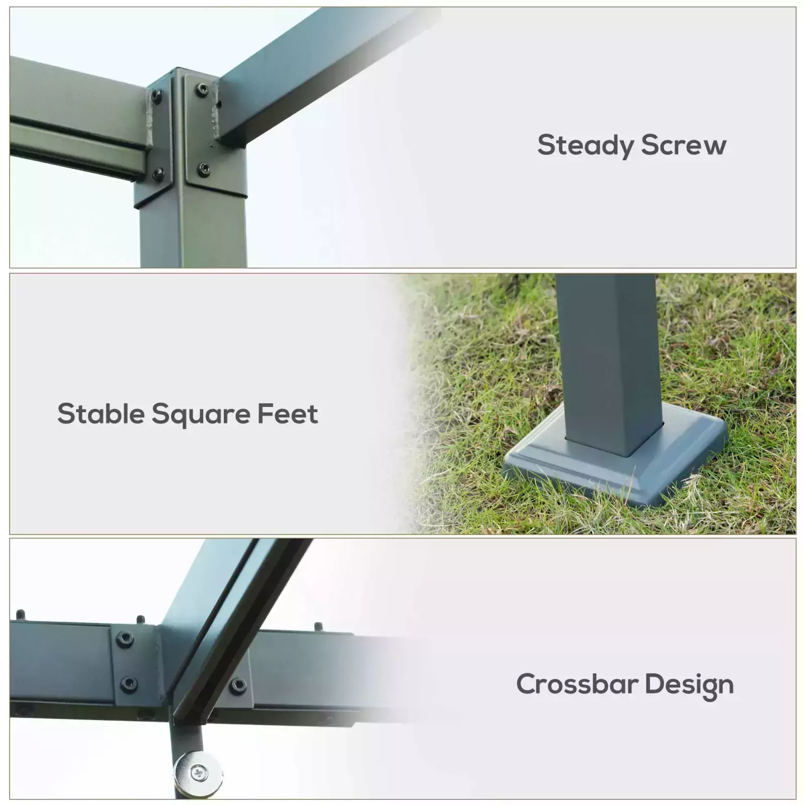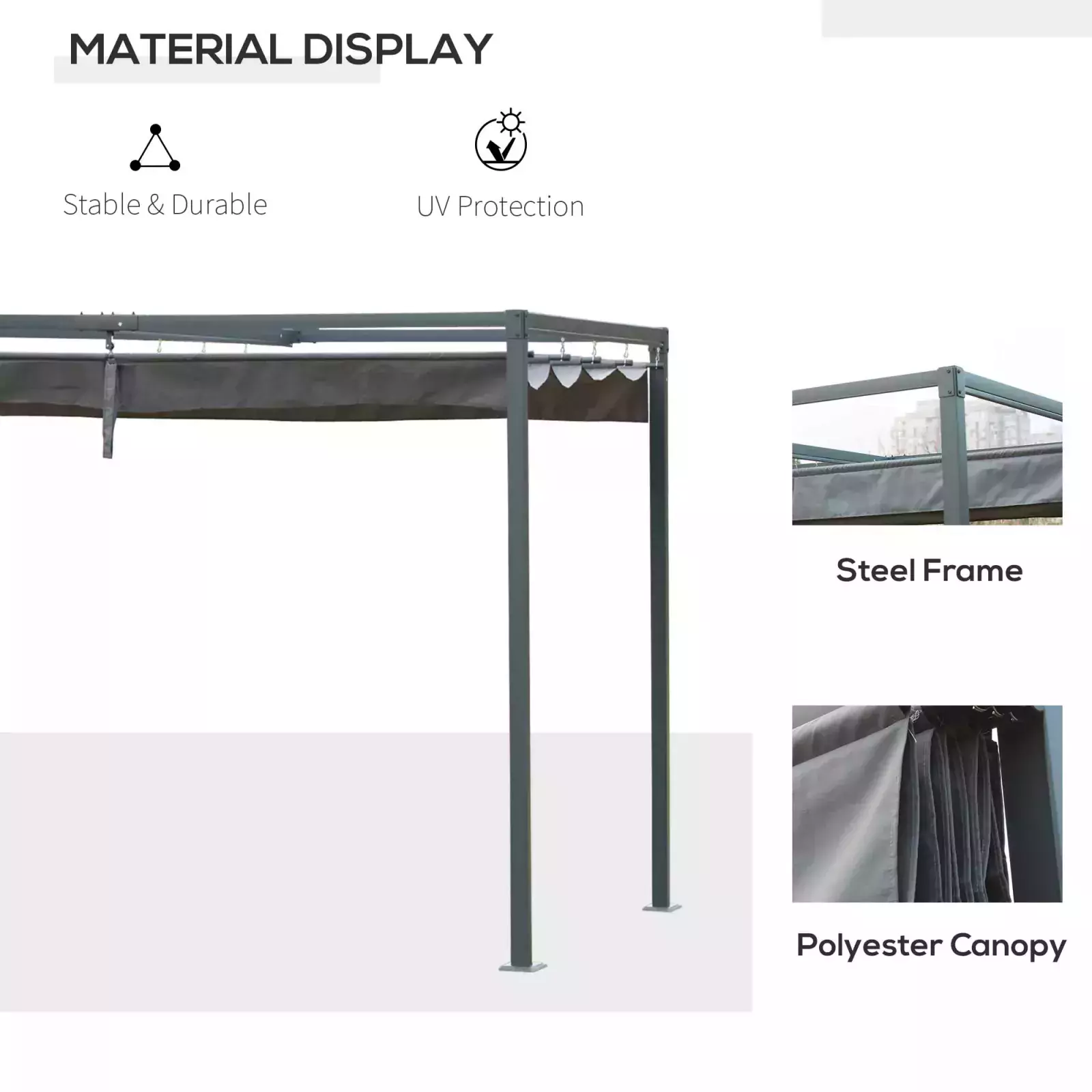 METAL FRAME: A tough structure which stands steadily, powder coated for extra strength. Rust-resistant means the pergola kit is suitable for outdoor use.