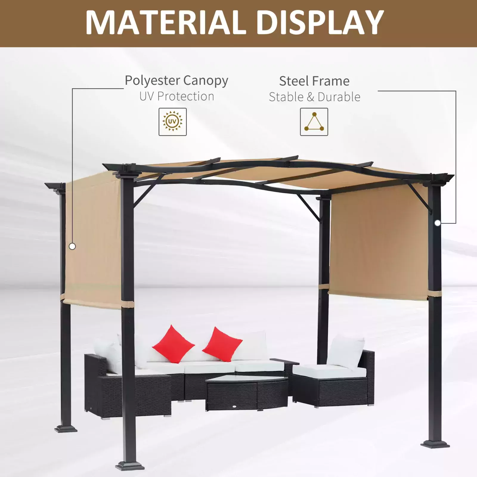 STEEL FRAME: Power coated and fitted with beams for extra strength, this frame of garden pergola is tough and stands steadily in place.