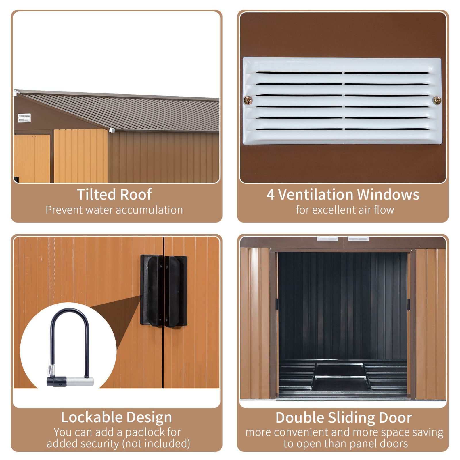 SLOPED ROOF: Allows water to roll down to the ground, preventing build up, stagnation and rust damage. DOUBLE SLIDING DOORS: Allows easy access inside and keeps everything out of site from neighbours etc.