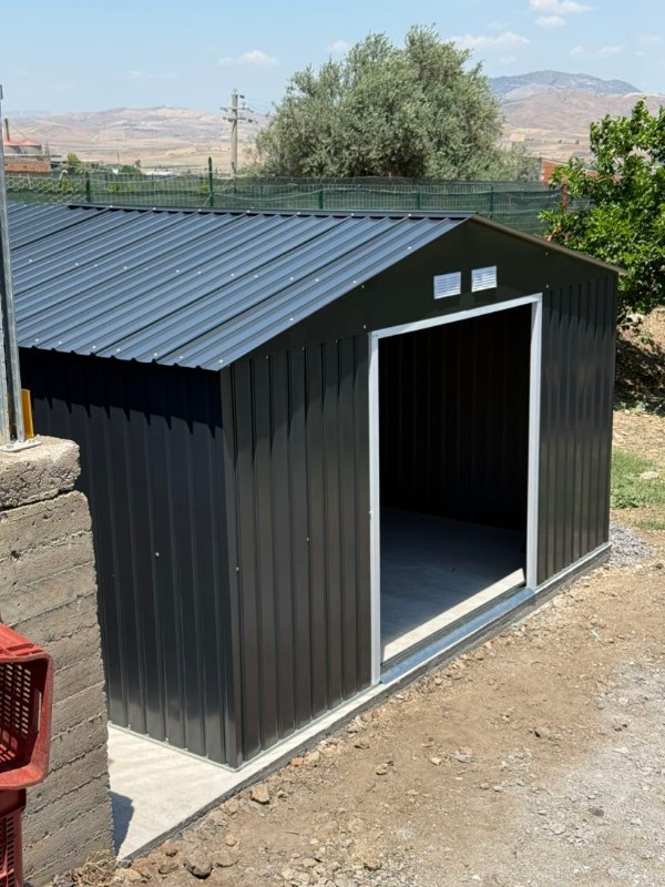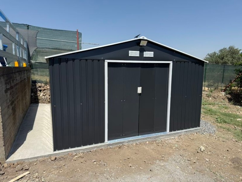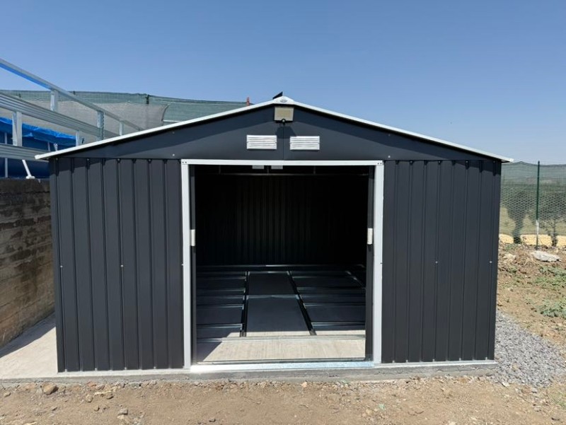 SLOPED ROOF: Allows water to roll down to the ground, preventing build up, stagnation and rust damage. DOUBLE SLIDING DOORS: Allows easy access inside and keeps everything out of site from neighbours etc.