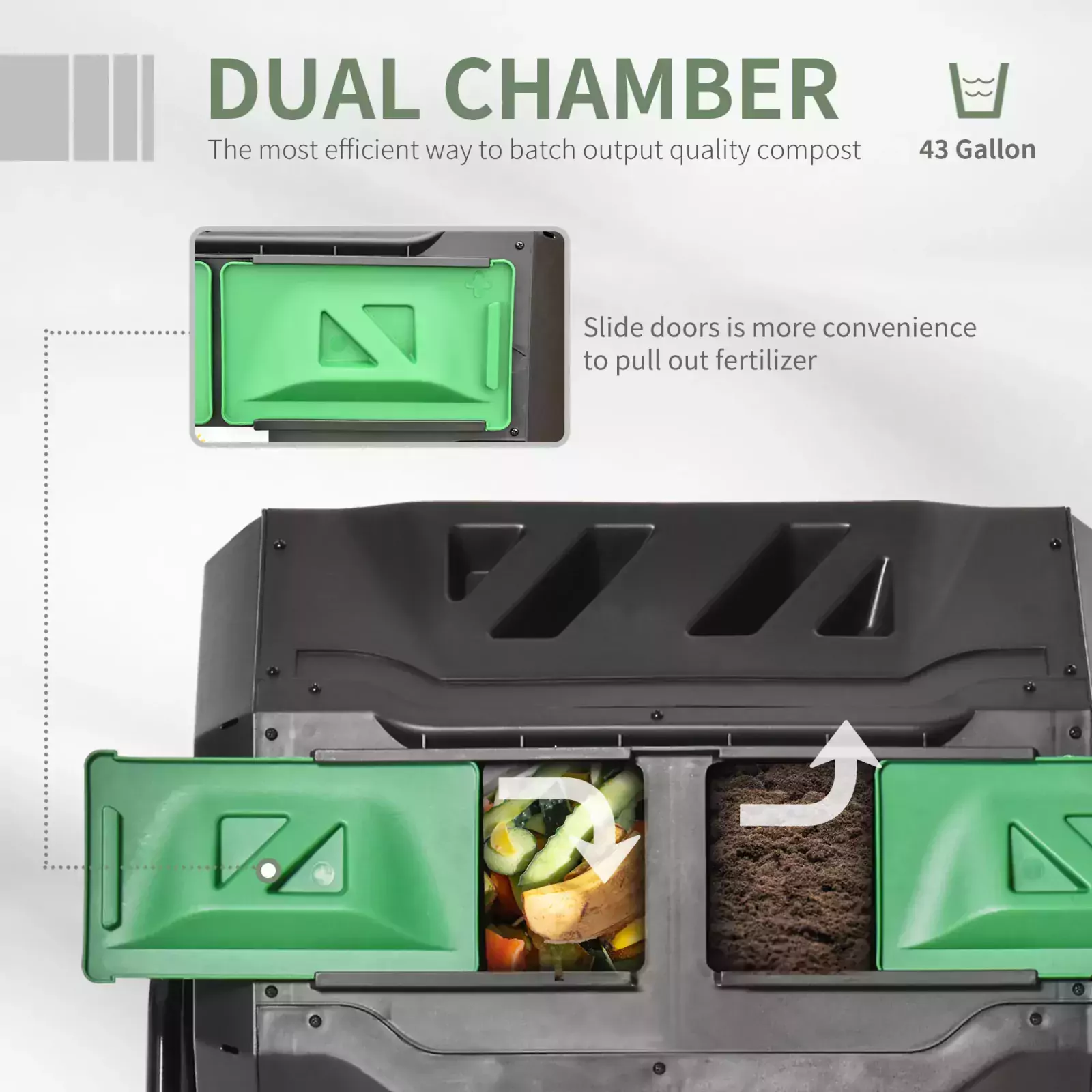 DUAL CHAMBER: Designed by 2 chambers which is the most efficient way to batch output quality compost. While one side is producing, you can add new ingredients to the other side at the same time. The constant exchange of materials on both sides creates a cycle, and you will get a sufficient and organic mixture