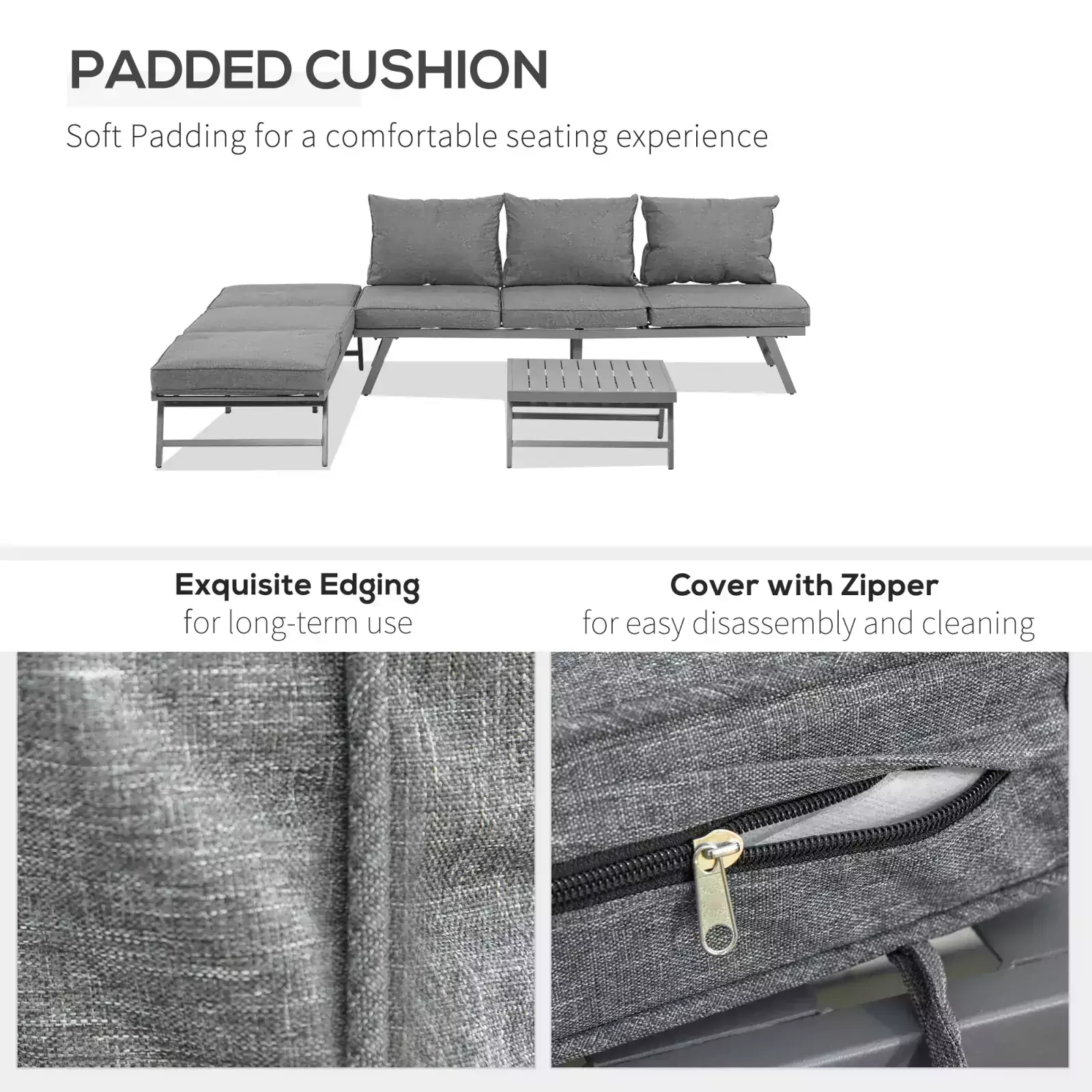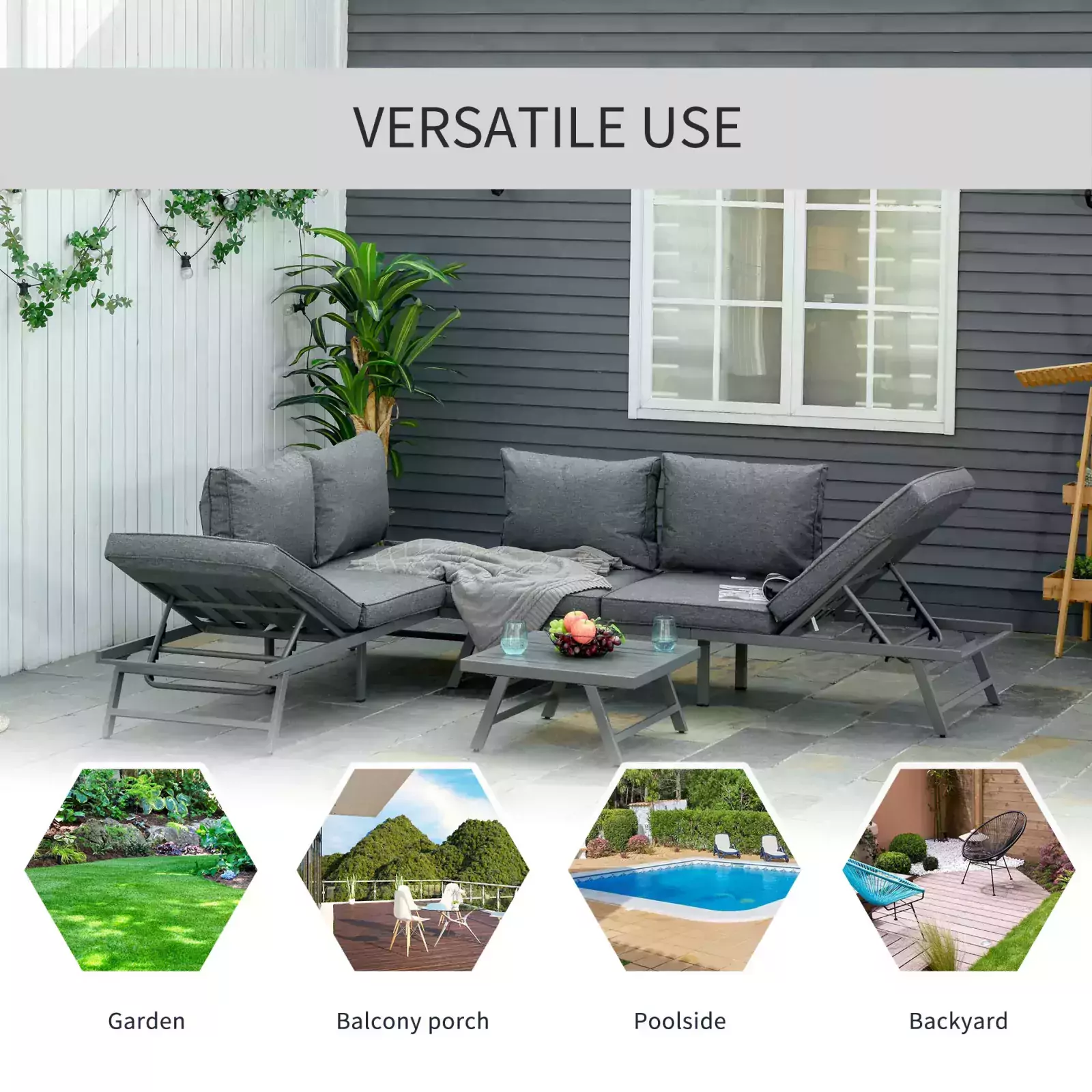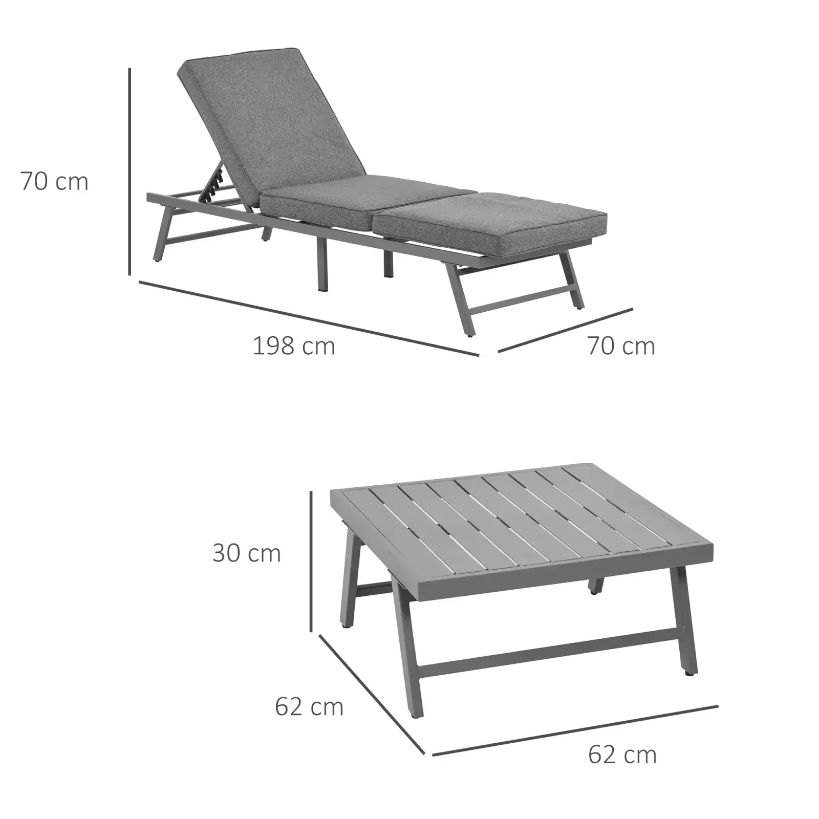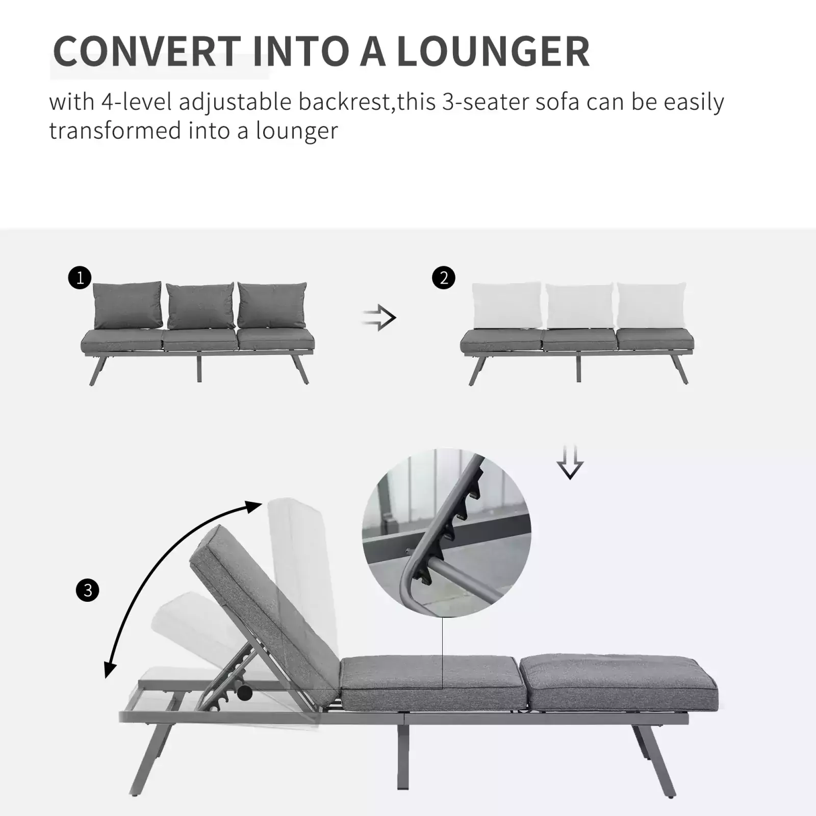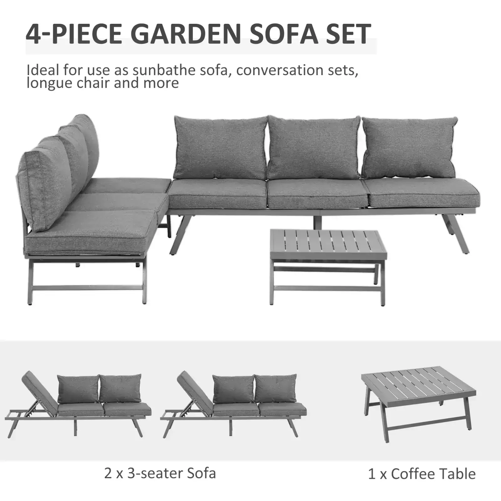Whether you want to relax with a few friends, or transform your outdoor time into lounging, go for this Outsunny 3 Piece Metal Garden Seating Set with Convertible Sofa – Grey. The two sofas can be changed into a lounger, where the backs can be set to four different positions, as well as removed. There are thick cushions on the seats and backs for comfort – you’ll find it hard to get up once sat down! Set is complete with a matching square table, giving a solid and safe place for keeping everything you need near you. Perfect for all outdoor and garden spaces.