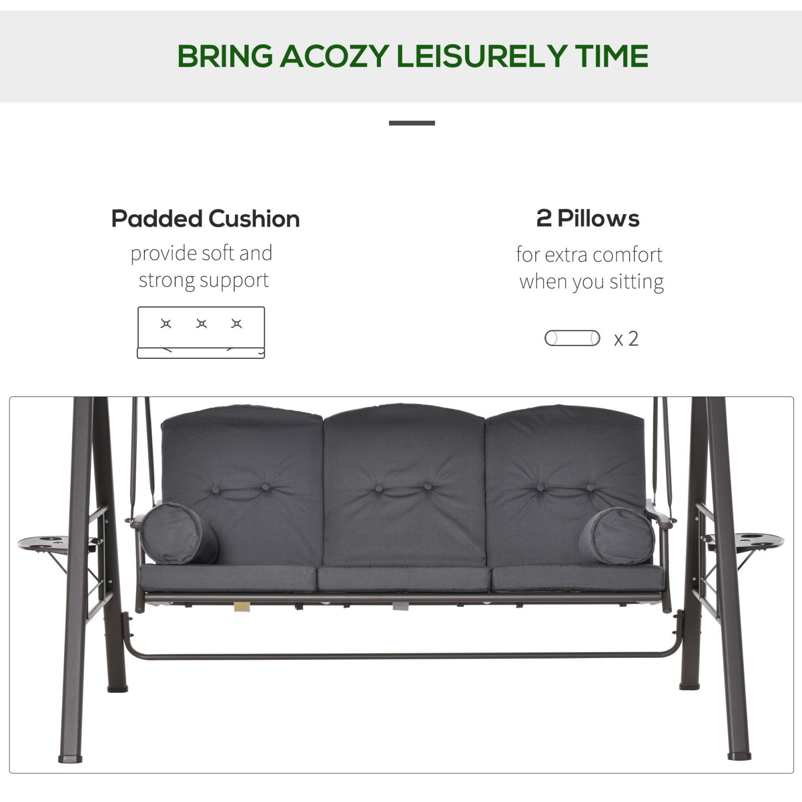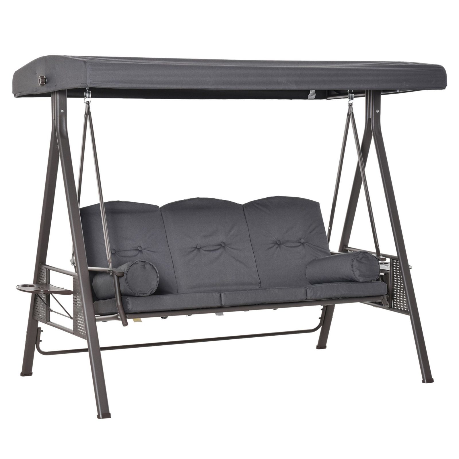 Outsunny is proud to present this stylish Outsunny 3 Seater Garden Swing Chair – Dark Grey. It features an arc-shaped canopy and flower-shaped seat back for aesthetic beauty. The top canopy provides sunshade for you while the storage trays on both sides makes essentials within reach. There are 3 seats for your family and friends to swing together in maximum comfort thanks to padded cushions. Your patio, garden, Deck, yard or lawn, wherever you place it, the eye-catching chair is designed bring elegance to your outdoor living area.