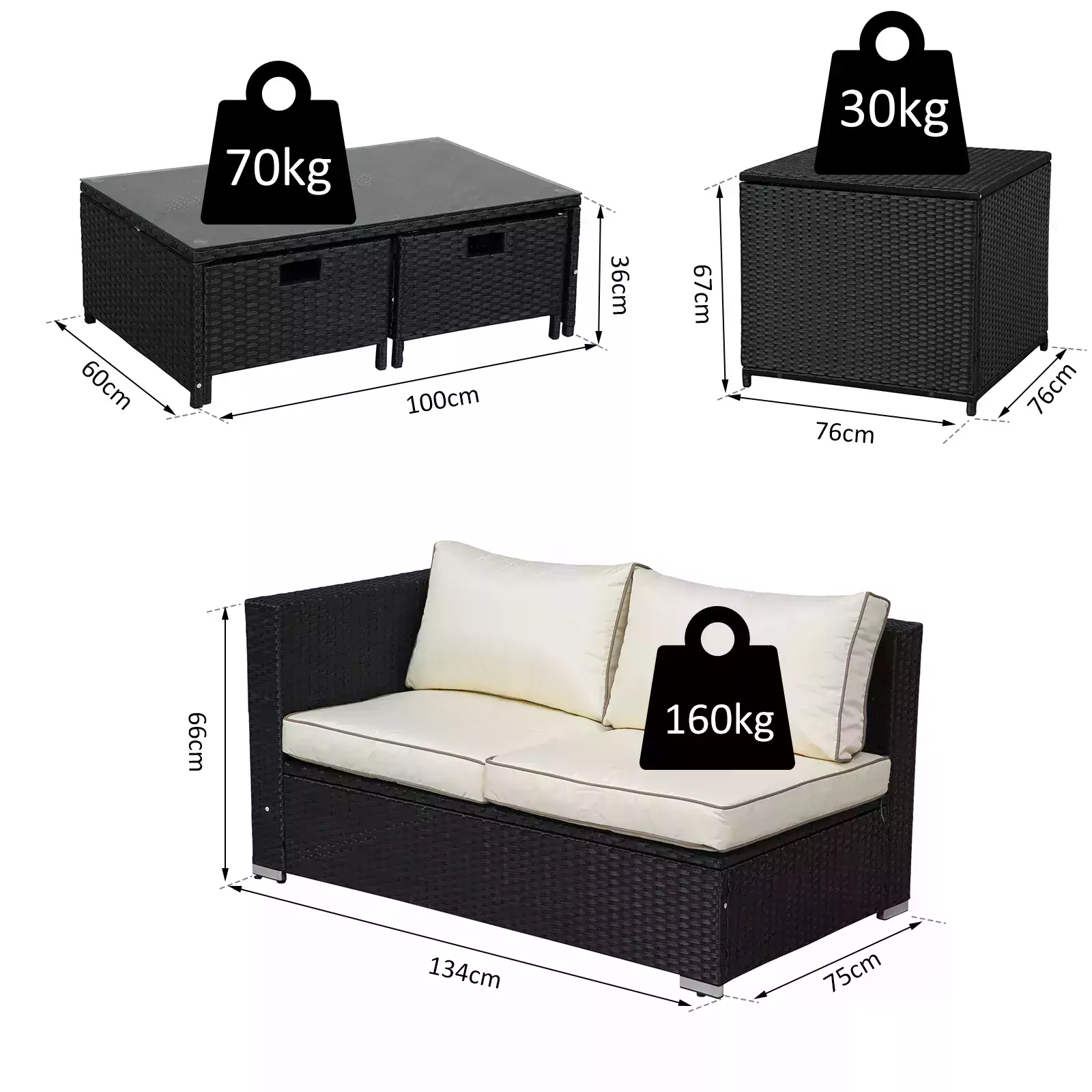- MAXIMUM LOAD WEIGHT: Sofa: 320kg. Storage table: 30kg. Coffee table: 70kg. ASSEMBLY REQUIRED.