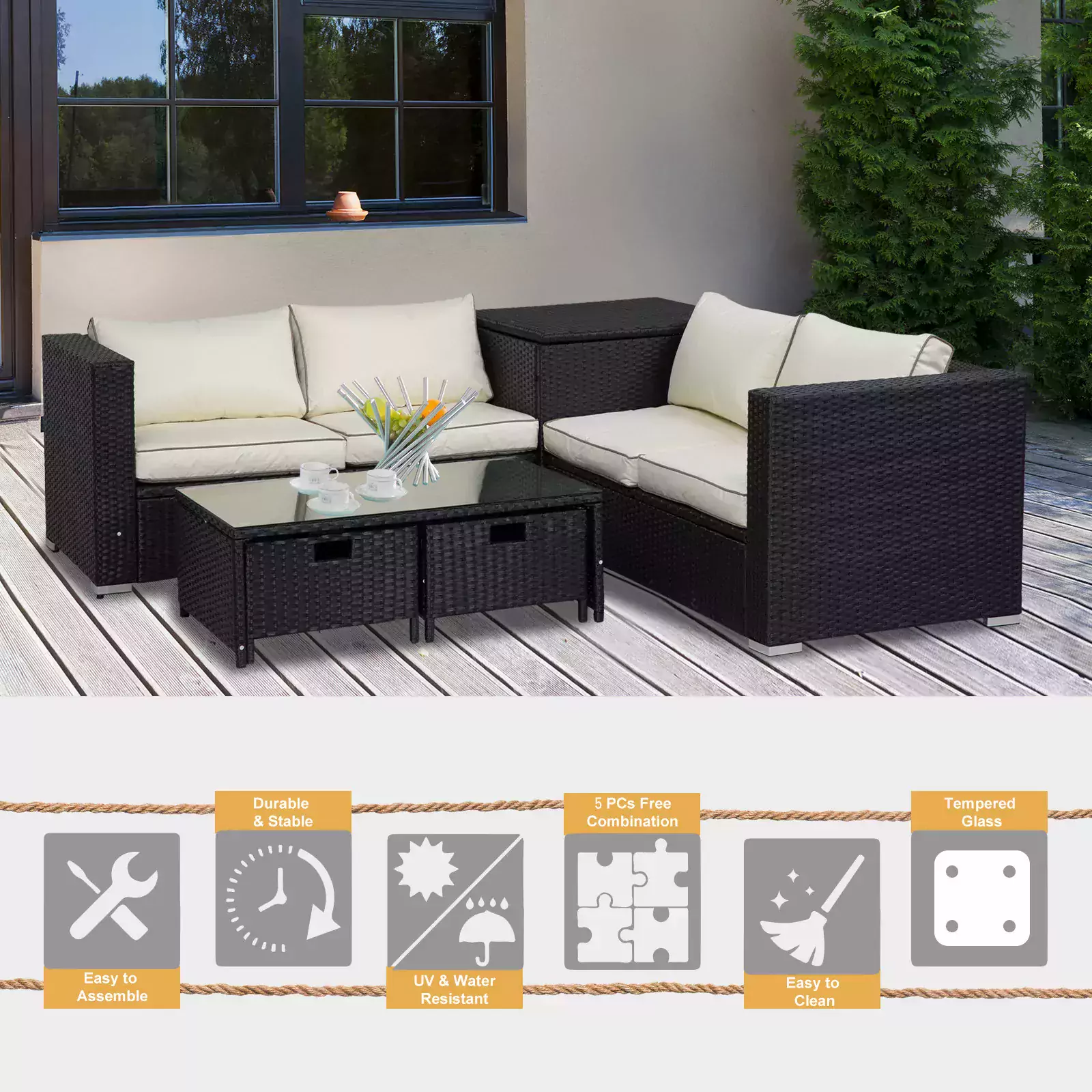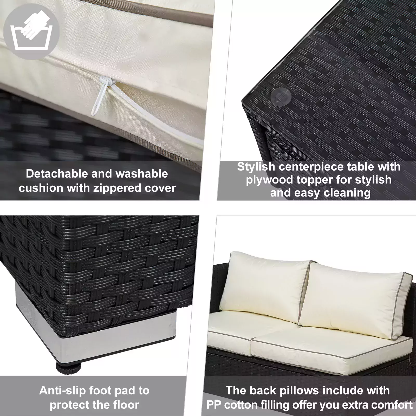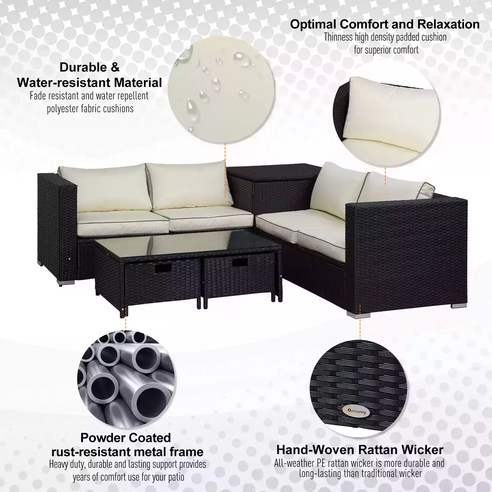 - FOUR-PIECE SET: Perfect for garden and outdoor areas, includes two two-seater sofas, each with one high wall on one end, a square storage table and a small coffee table. Seats up to four people with plenty of room to move.
