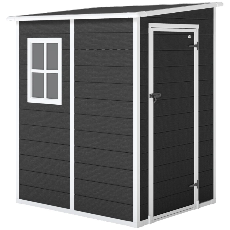 This Outsunny 4’x5′ Plastic Lean To Shed with Window – Black is a protective shelter for tools and equipment.