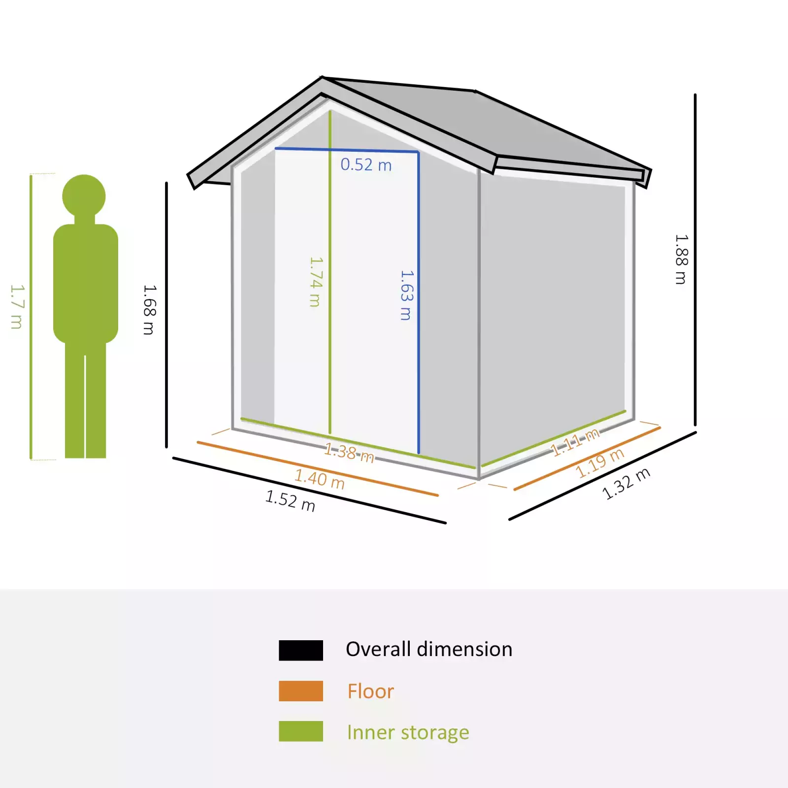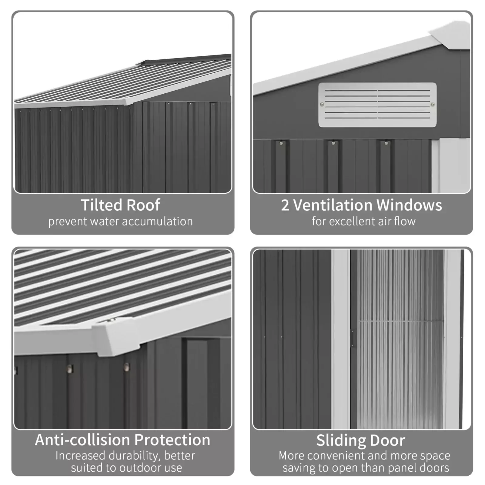 The steel tool storage shed has distinct advantages over traditional wooden models, water protection and durability for outdoor use. Large space for keeping tools, equipment, bikes. A sloped roof is easy for rain draining and sliding doors make it easy to access. This backyard storage shed can be your perfect choice for the patio and lawn.