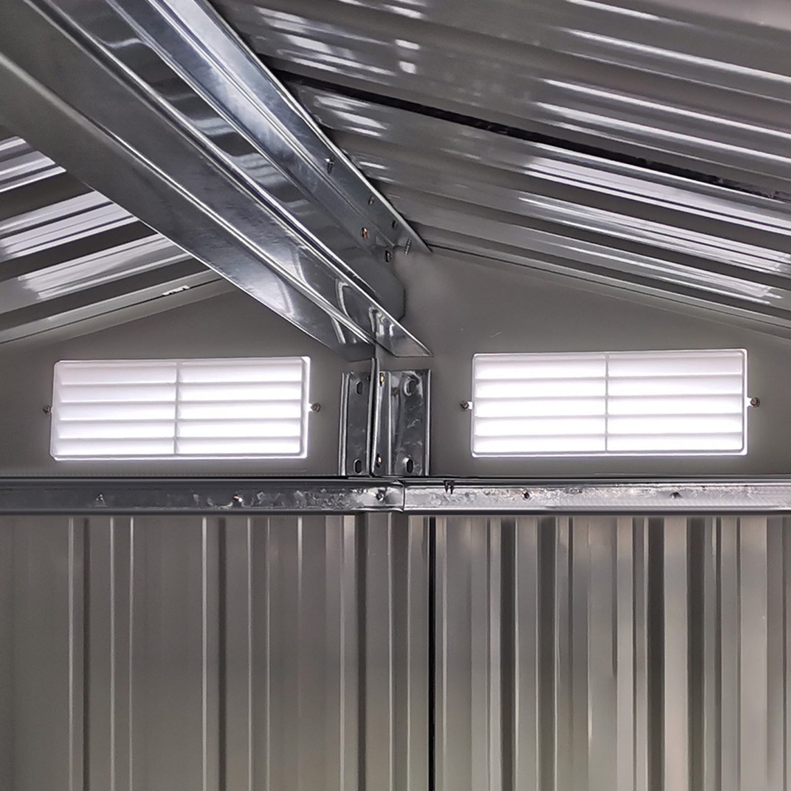 The steel tool storage shed has distinct advantages over traditional wooden models, water protection and durability for outdoor use. Large space for keeping tools, equipment, bikes. A sloped roof is easy for rain draining and sliding doors make it easy to access. This backyard storage shed can be your perfect choice for the patio and lawn.