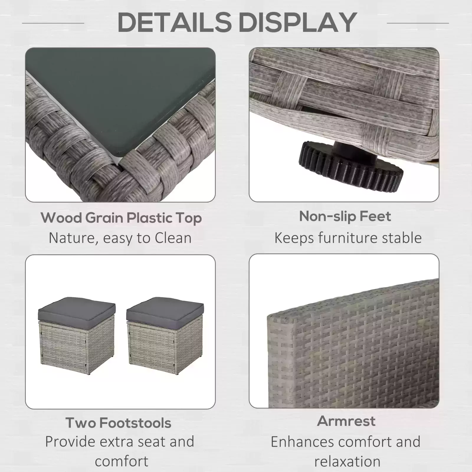 - SIX-PIECE SET: The garden sofa set comes with two armchairs, two footstools, a three-seater sofa, and a tempered glass dining table. Footstools of the grey rattan sofa set can also be used as extra seats. Seats up to seven people.