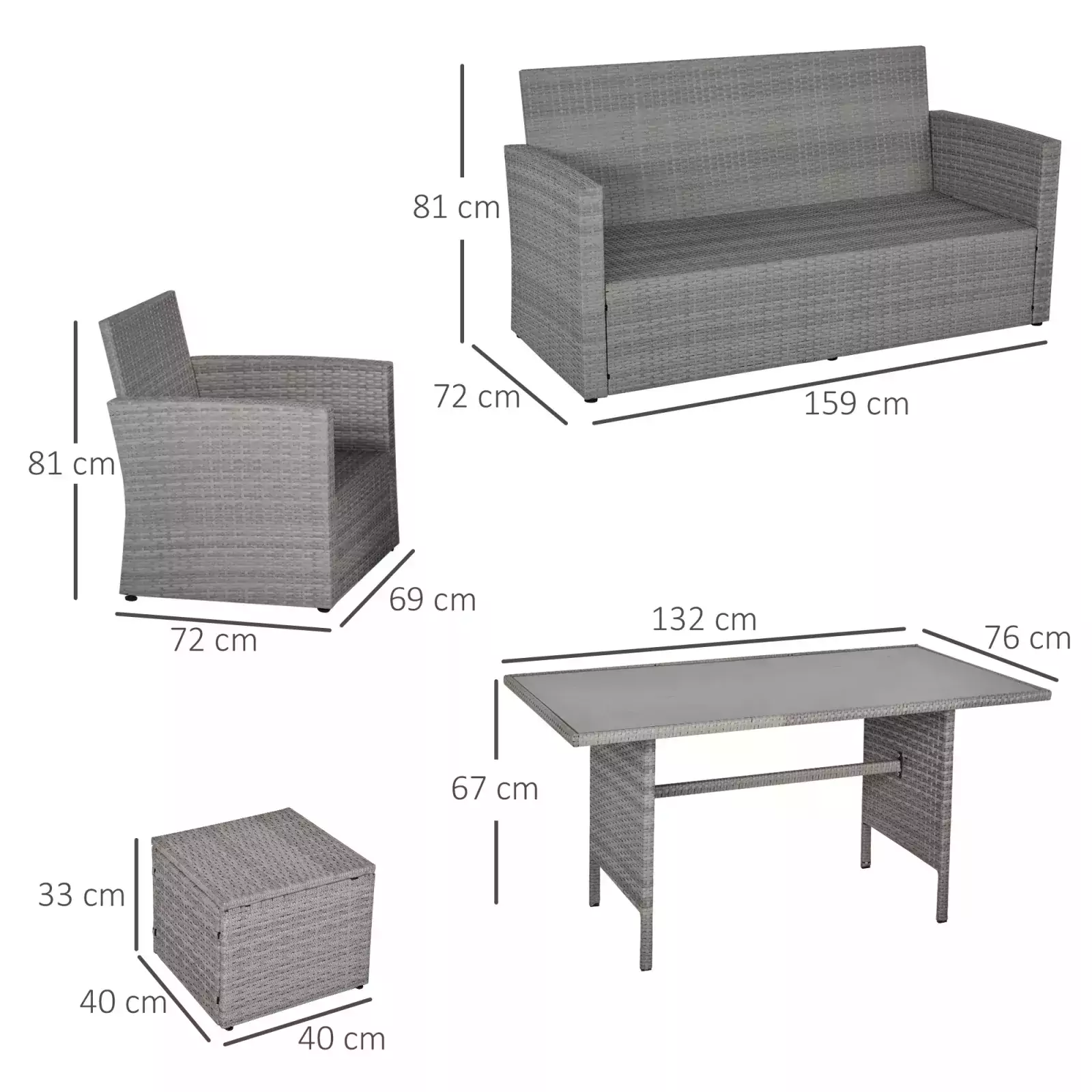 - DIMENSIONS: Chair: 81H x 69W x 72Dcm. Sofa: 81H x 159W x 72Dcm. Footstool: 33H x 40W x 40Dcm. Table: 67H x 132L x 76Wcm.