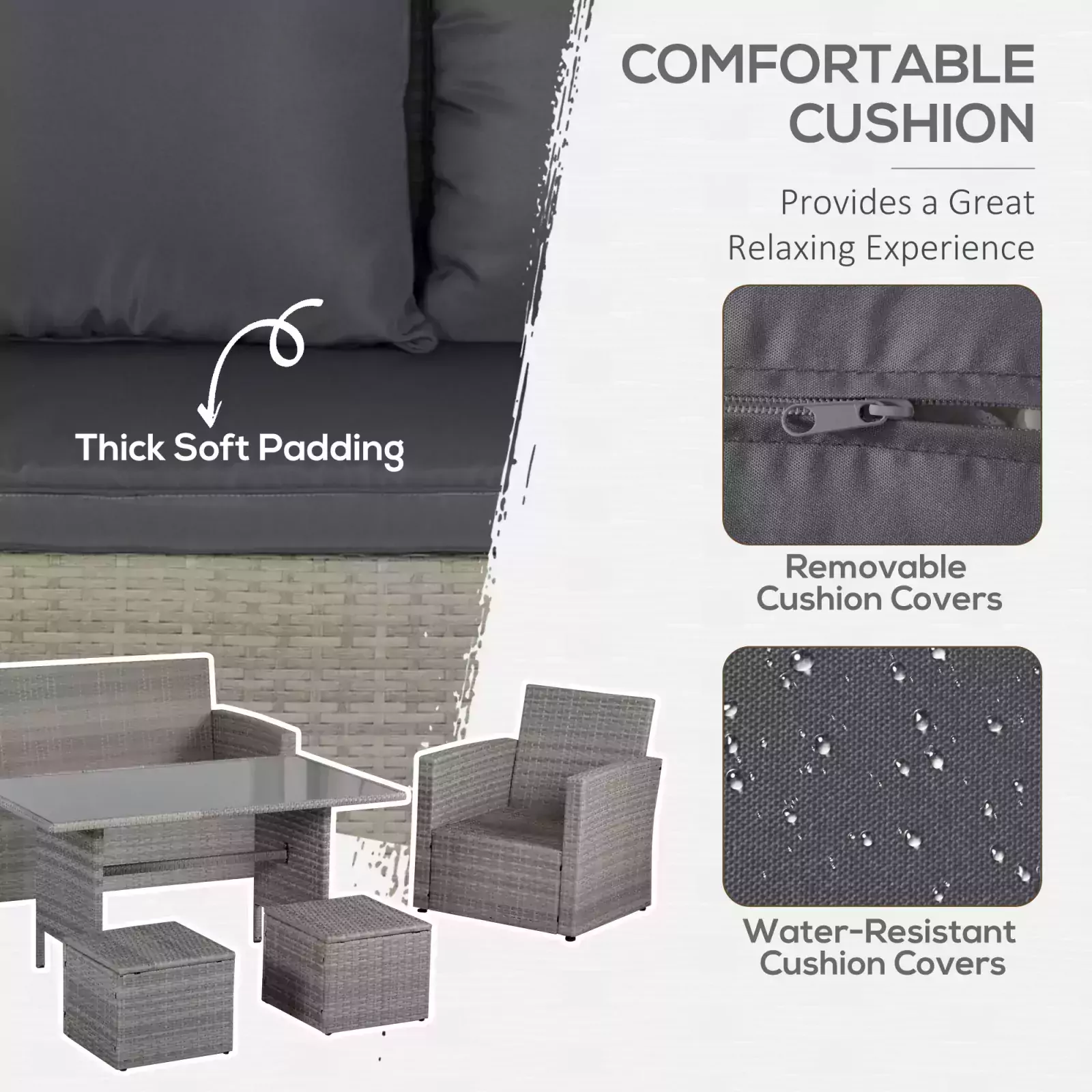 - COMFORTABLE: All seats of the rattan furniture come with plush cushions so you can sit for long periods without your body aching(the cushion covers can not remove to wash).