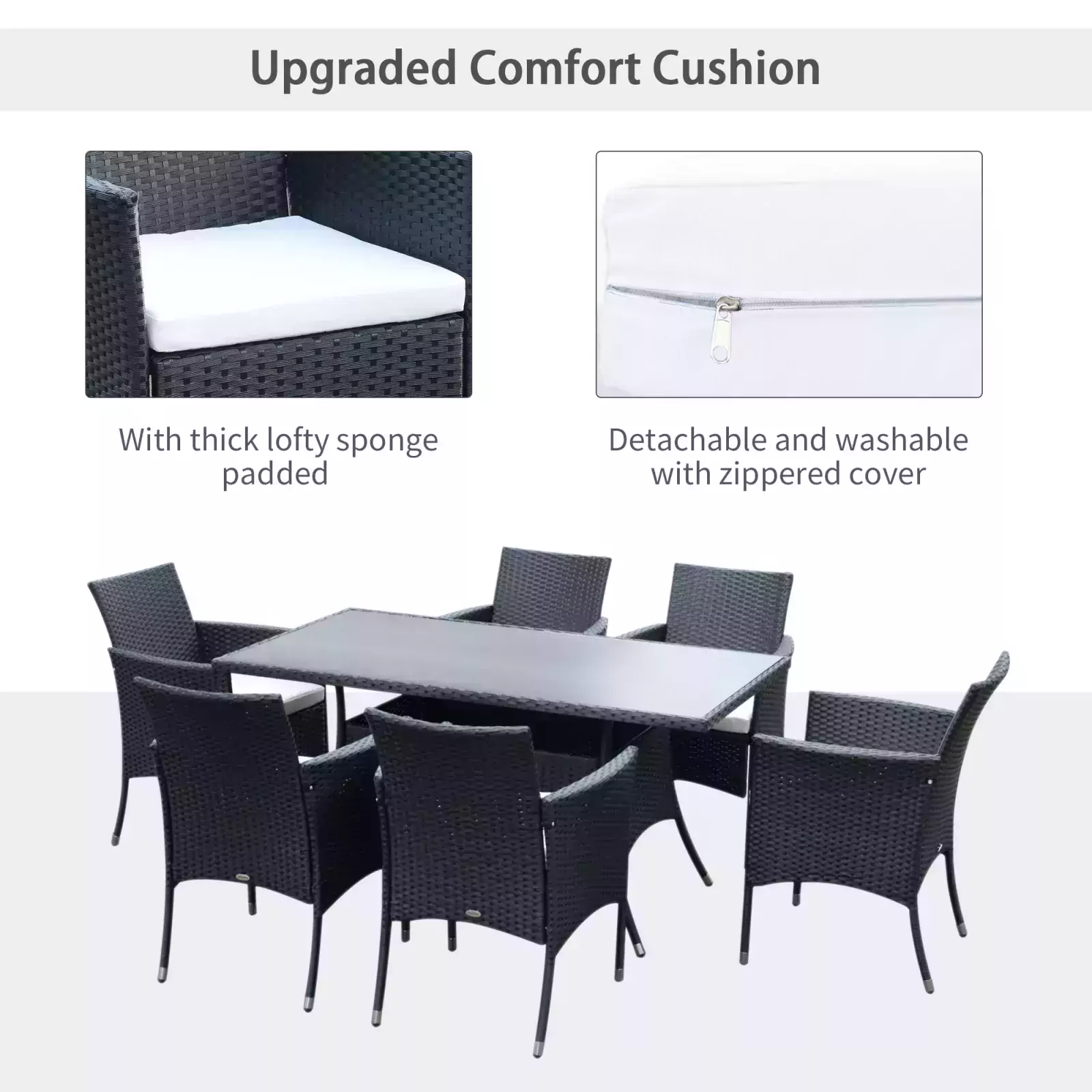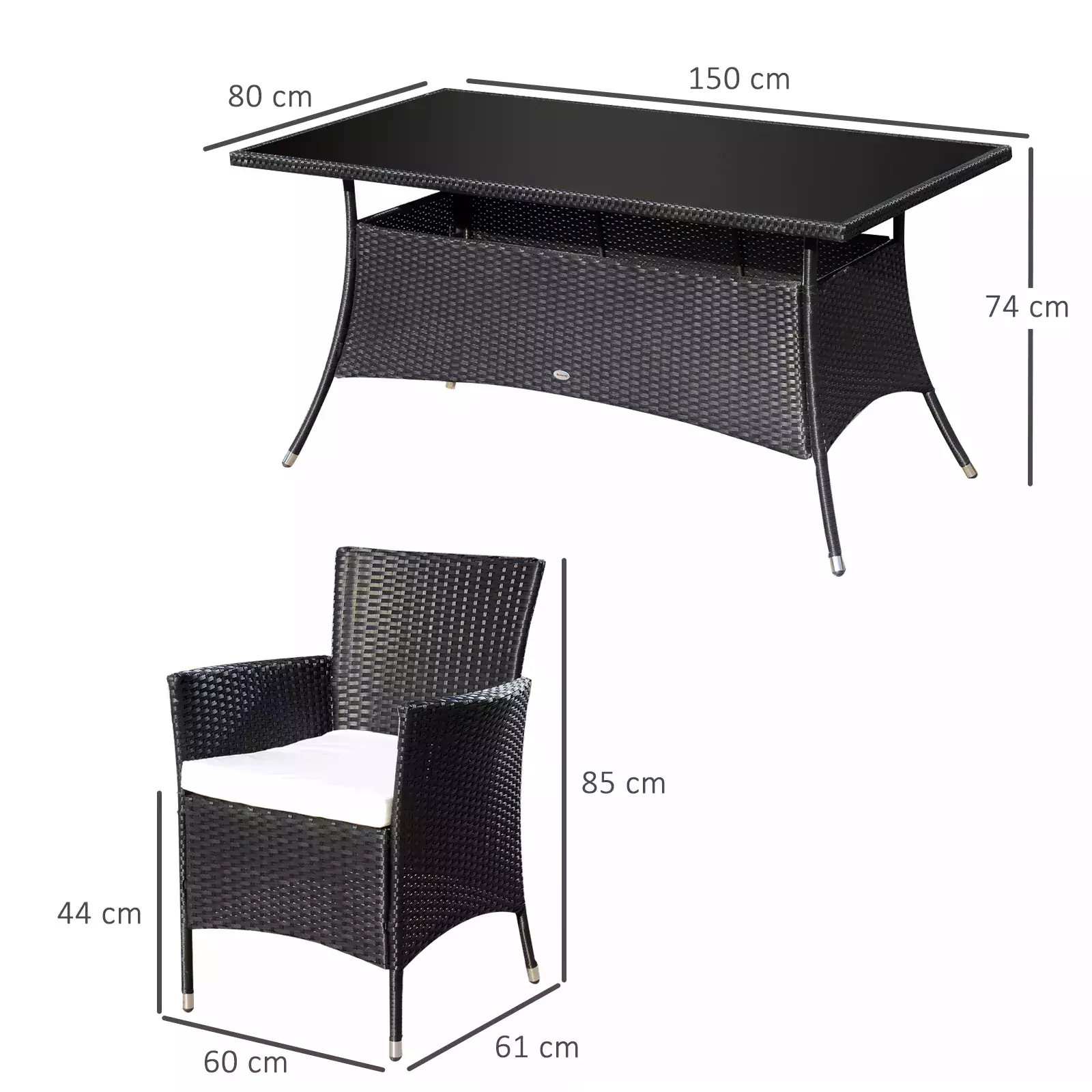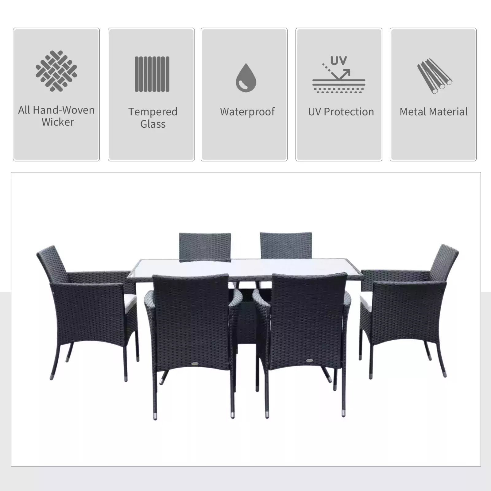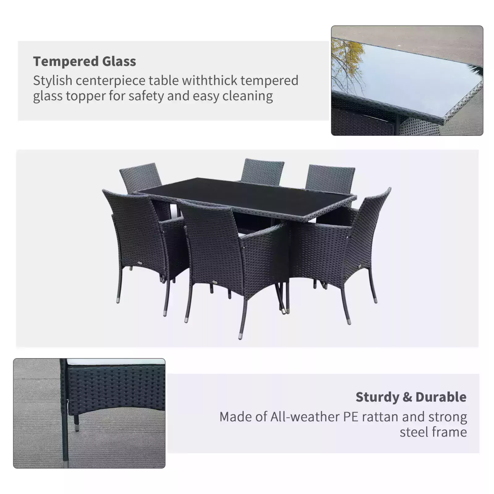 This deluxe Outsunny 6-Seater Rattan Dining Set – Black is a great addition to patio or garden, made with high quality PE rattan and durable steel construction for sturdiness and long lasting. It also comes complete with a 5mm thick tempered glass for the table top, so you can use on a daily basis. It’s easy to maintain and keep clean using a damp cloth.