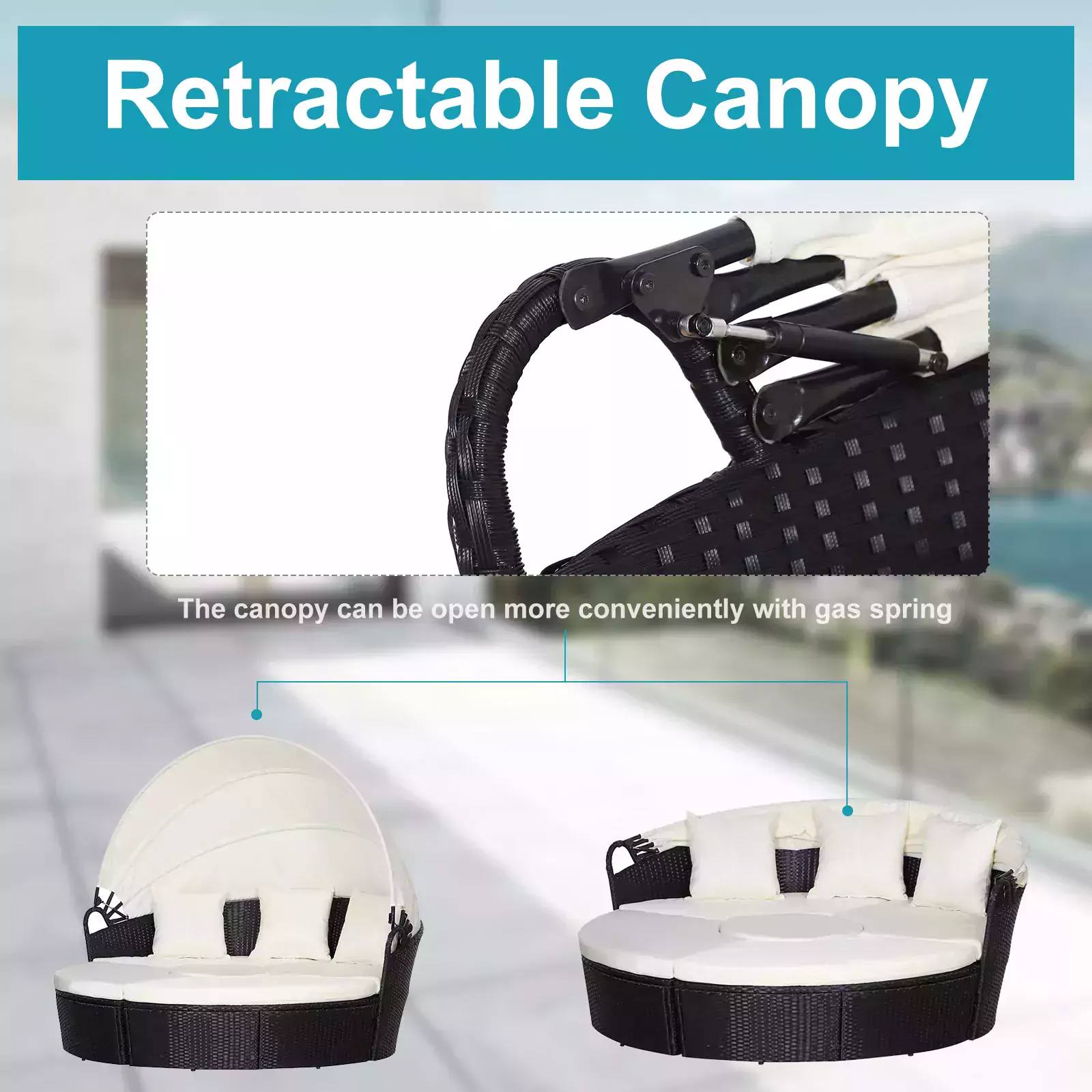 OVERHEAD CANOPY: Retractable to put up and down easily, allowing you to block out UV and sunlight when wanted. ADJUSTABLE FEET: Allows bed to be kept balanced and stable on the floor for optimum comfort.