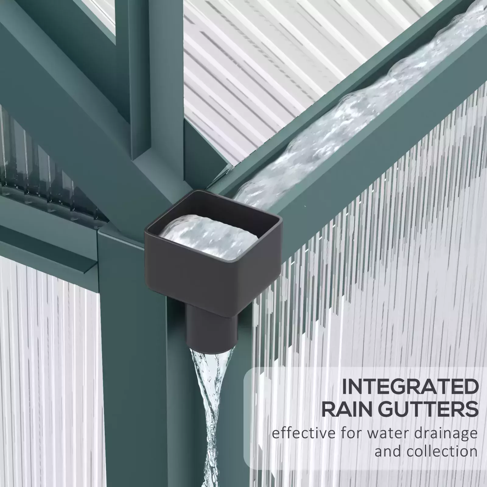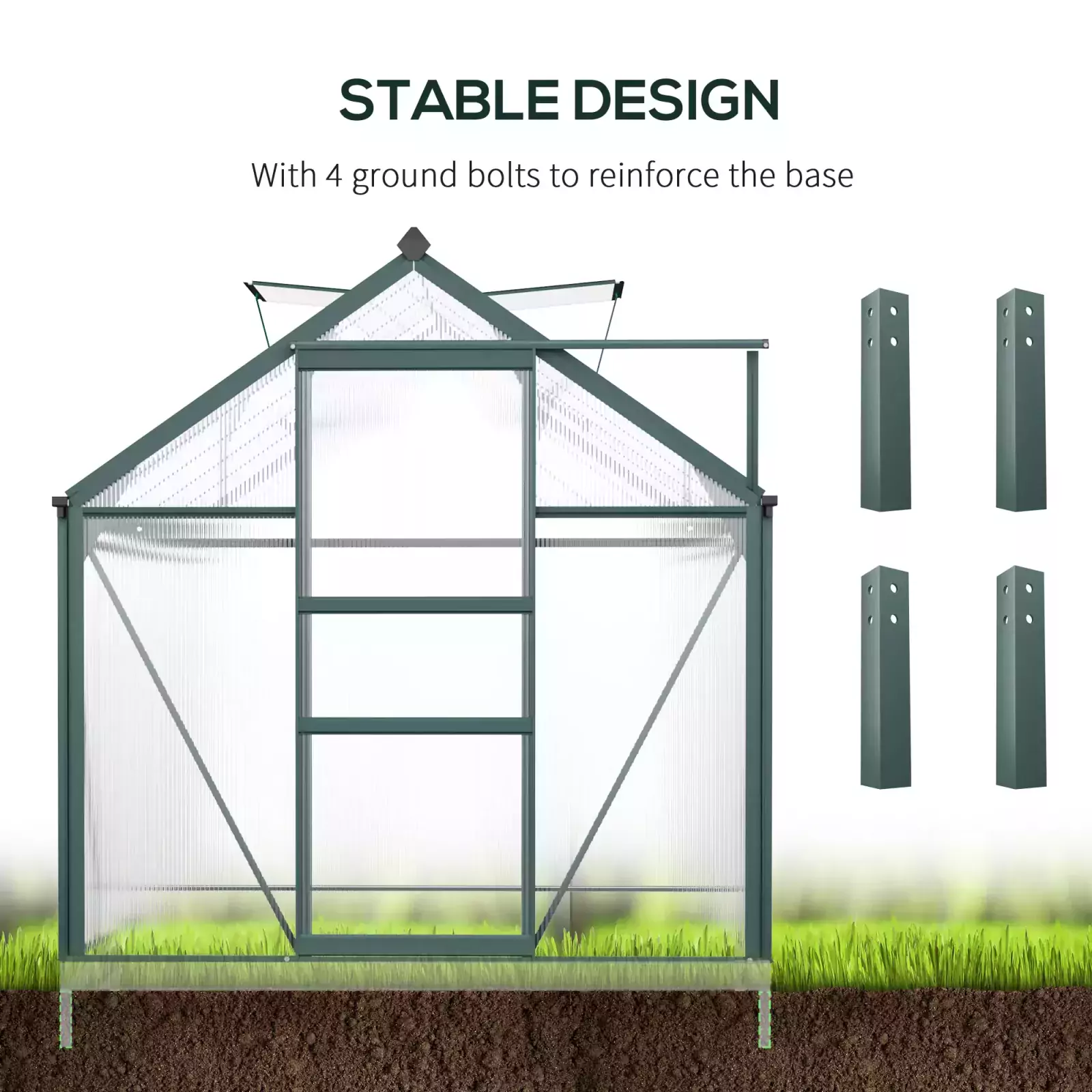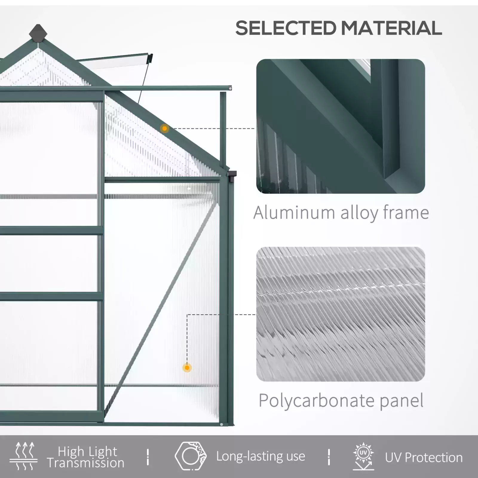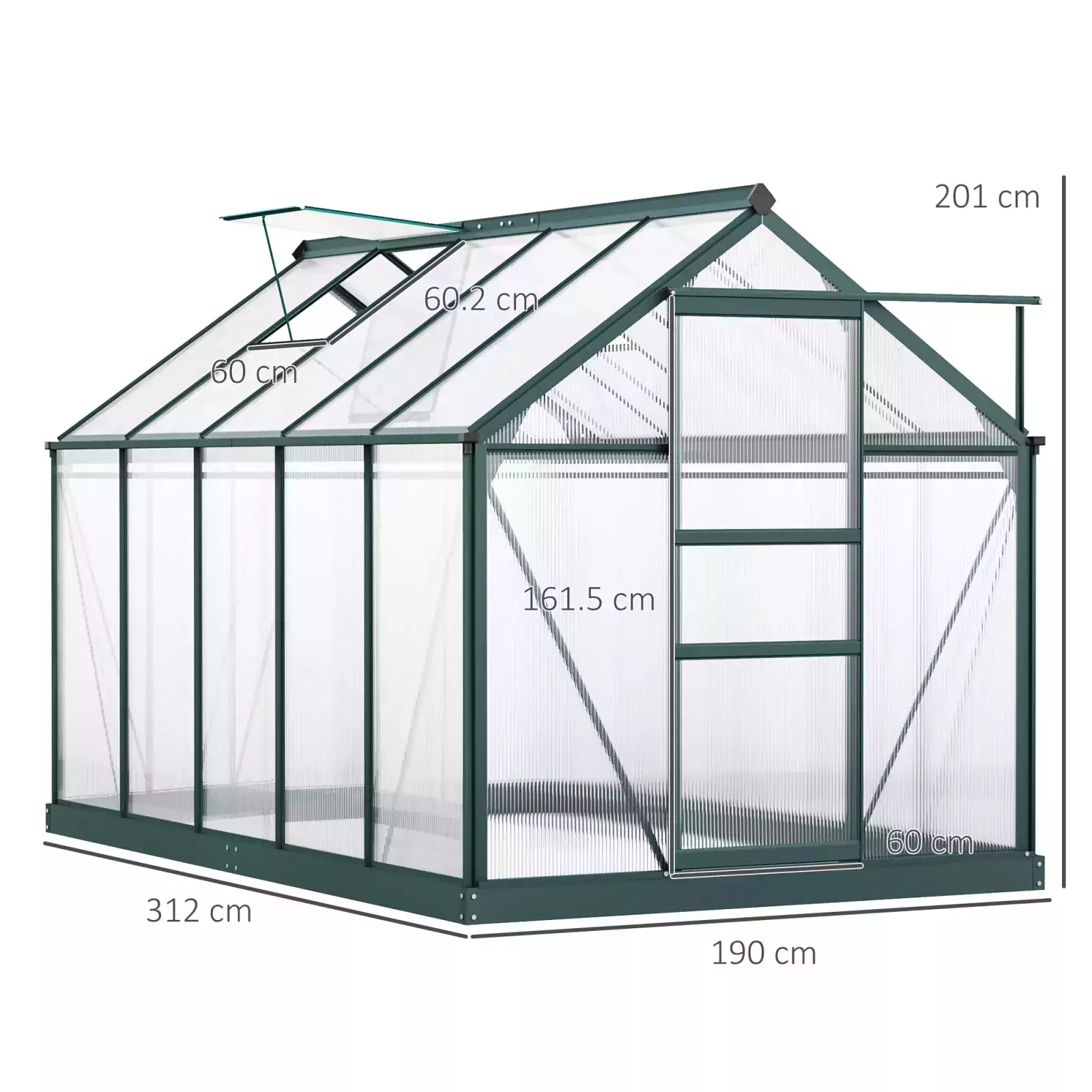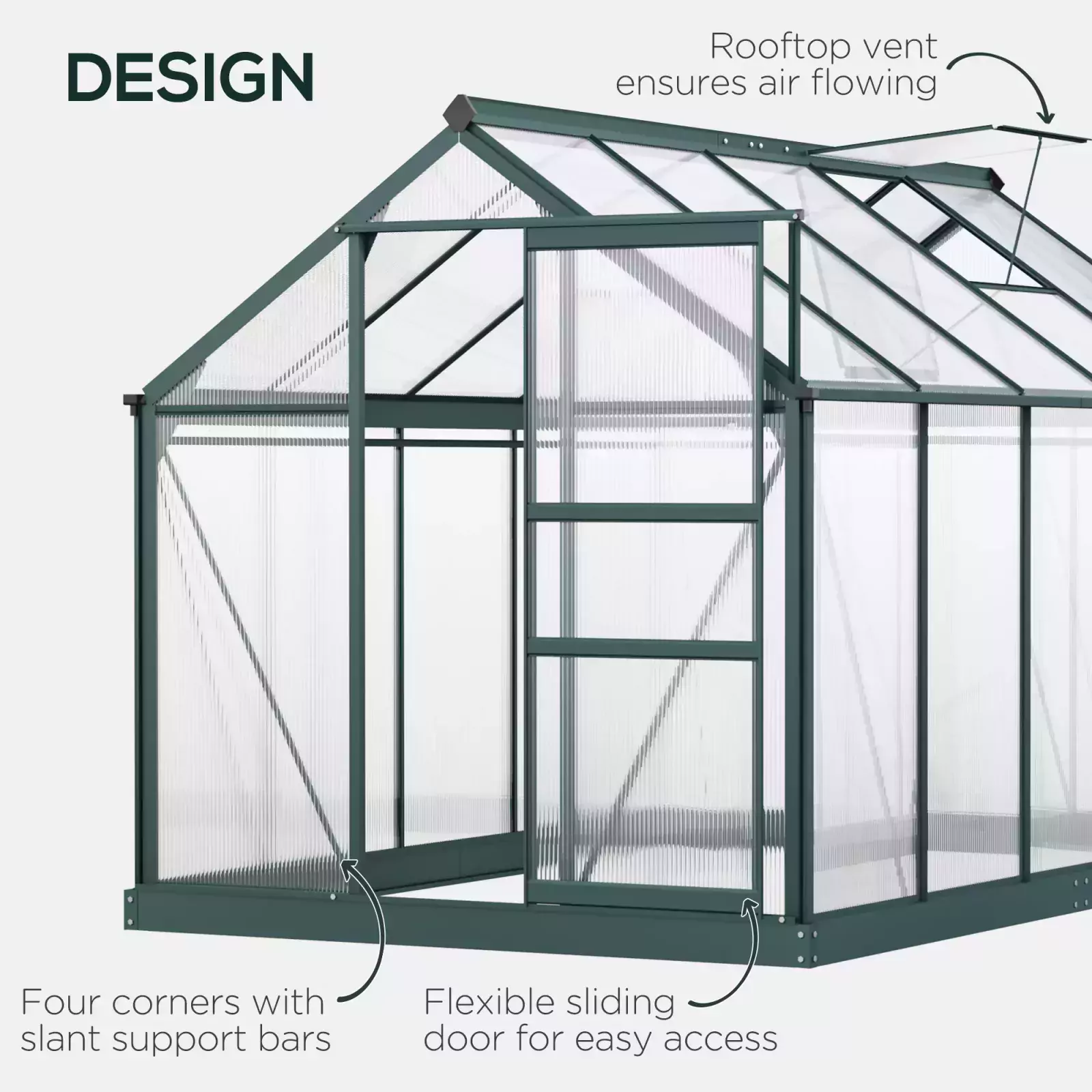 The Outsunny 6’x10′ Clear Polycarbonate Greenhouse – Green is perfect for the home gardening enthusiast who is looking for a way to stay in the soil all year-round. It offers all the protection your plants need to thrive without having to spend a great deal of green yourself. The powder-coated aluminium frame and UV-resistant, polycarbonate sheets will keep your plants, vegetables, and more safe. These transparent sheets allow natural lighting to pass throughout the entire structure. A rooftop vent ensures excellent ventilation for your unit. A convenient single sliding door design provides easy access to the inside. Easy to assemble and take down, our Outsunny polycarbonate aluminium greenhouse is the ideal solution for keeping your plants happy and healthy throughout the year.