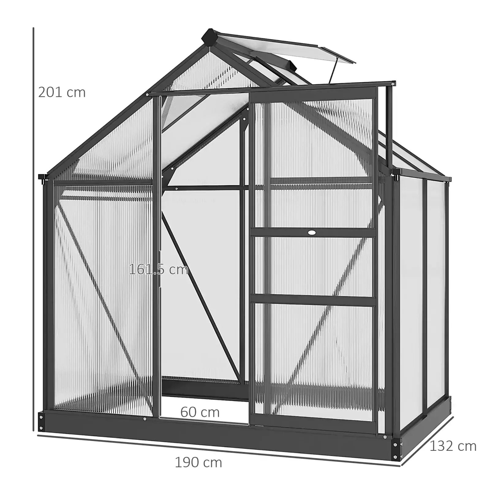 The Outsunny 6’x4′ Clear Polycarbonate Greenhouse – Grey is perfect for the home gardening enthusiast. The walk in greenhouse’s powder-coated aluminium frame and sheets will keep your plants, vegetables, and more safe. Heavy-duty greenhouse’s rooftop vent ensures excellent ventilation for your unit. A convenient single sliding door design provides easy access to the transparent greenhouse inside. Our Outsunny outdoor greenhouse is the ideal solution for keeping your plants healthy throughout the year.