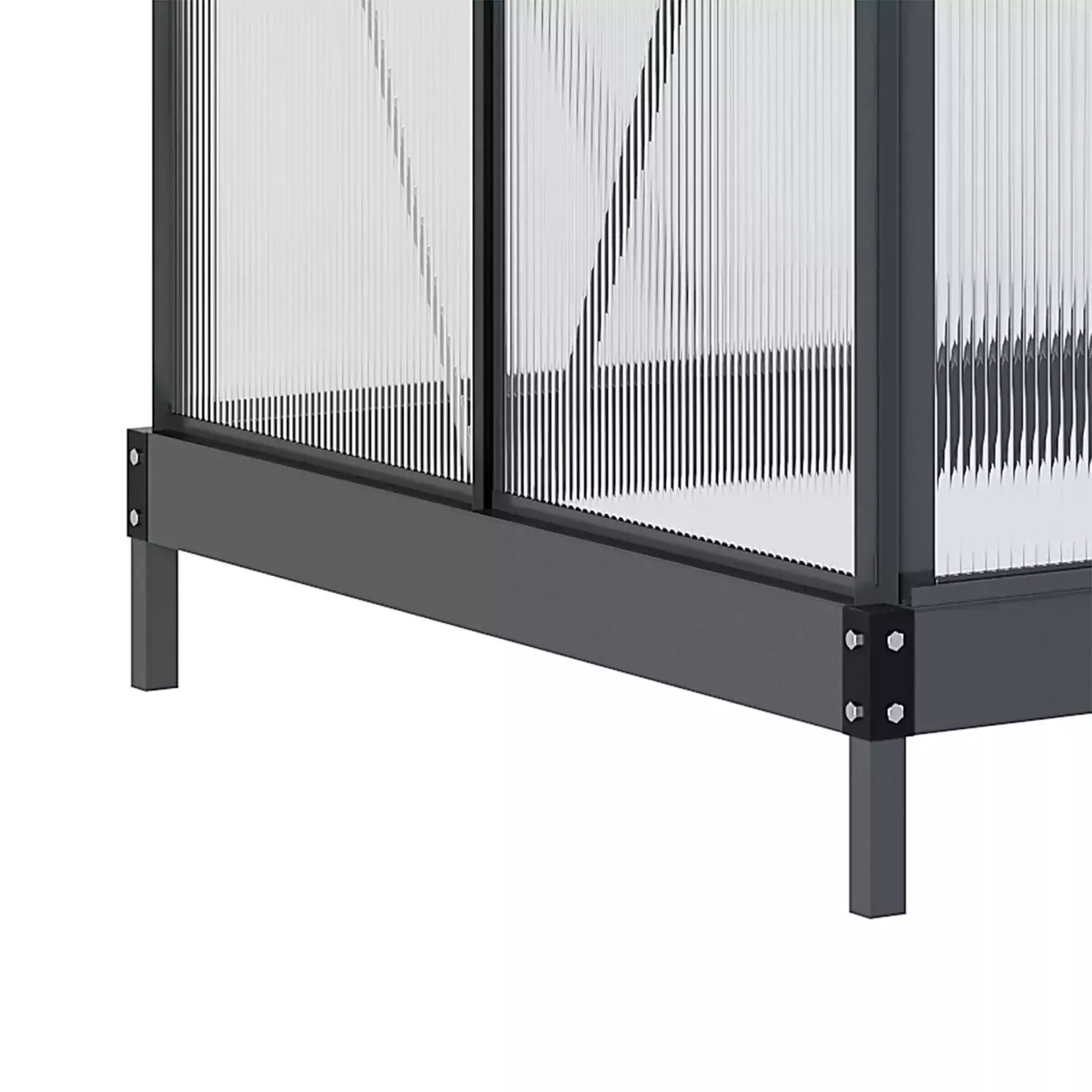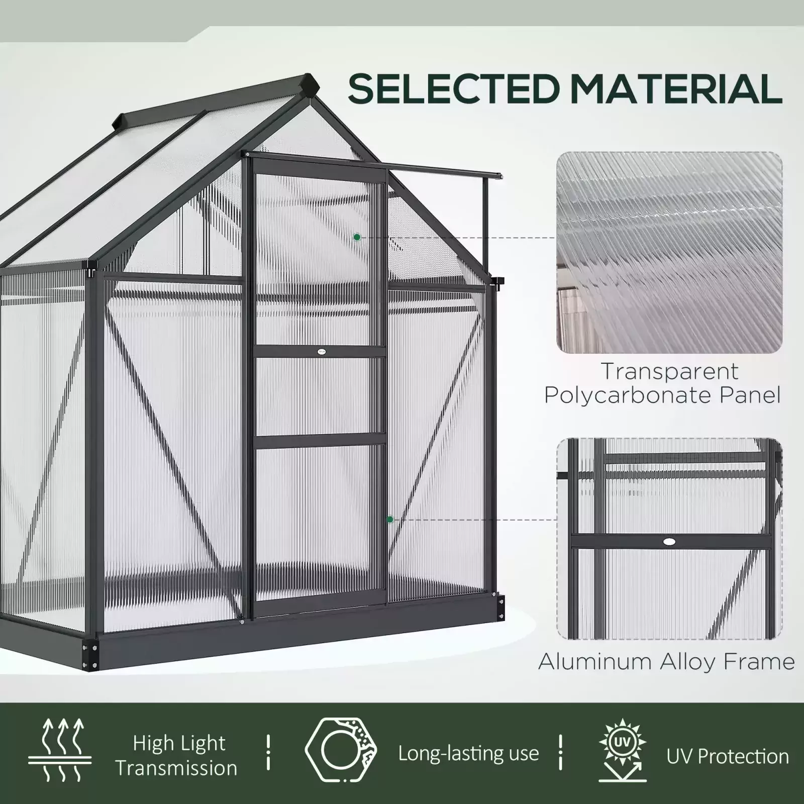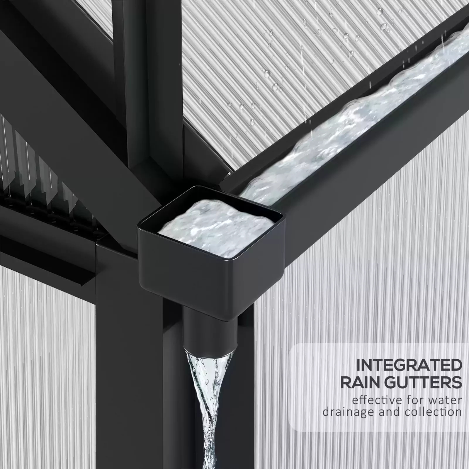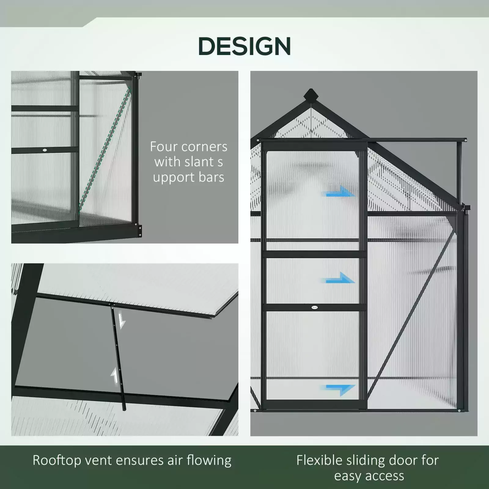 Sliding door: A sliding door offers easy access to the green house for garden and the hobby greenhouse is made out of the same solid material as the rest of the structure. Integrated rain gutters on the bottom are effective for water drainage and collection.