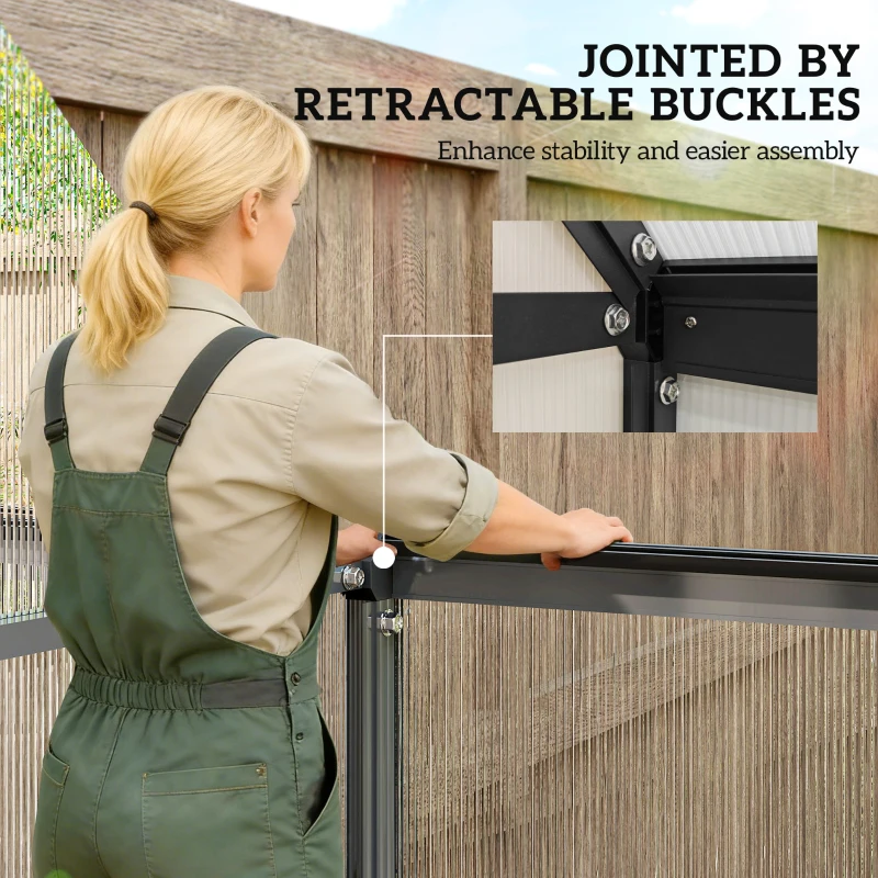 Its rust-resistant aluminium frame jointed by retractable buckles offers enhanced stability and easier assembly. UV resistant polycarbonate panels allow light transmission while retaining heat.