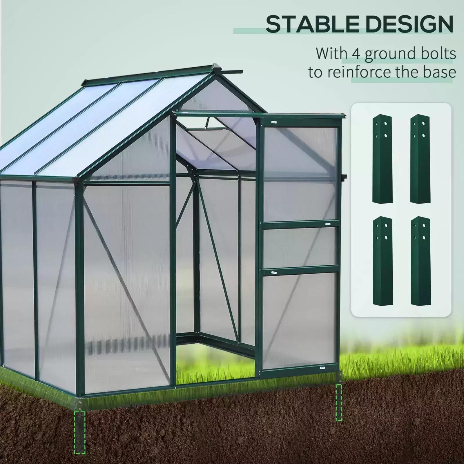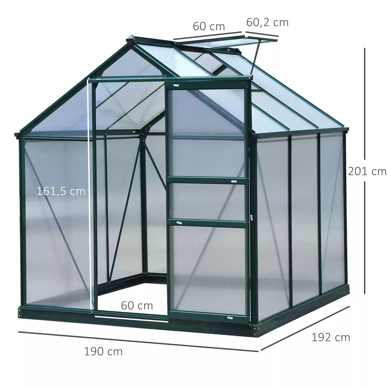 The Outsunny 6’x6′ Clear Polycarbonate Greenhouse – Green is perfect for the home gardening enthusiast. The walk in greenhouse’s powder-coated aluminium frame and UV-resistant sheets will keep your plants, vegetables, and more safe. Heavy duty greenhouse’s rooftop vent ensures excellent ventilation for your unit. A convenient single sliding door design provides easy access to the transparent greenhouse inside. Our Outsunny outdoor greenhouse is the ideal solution for keeping your plants healthy throughout the year.