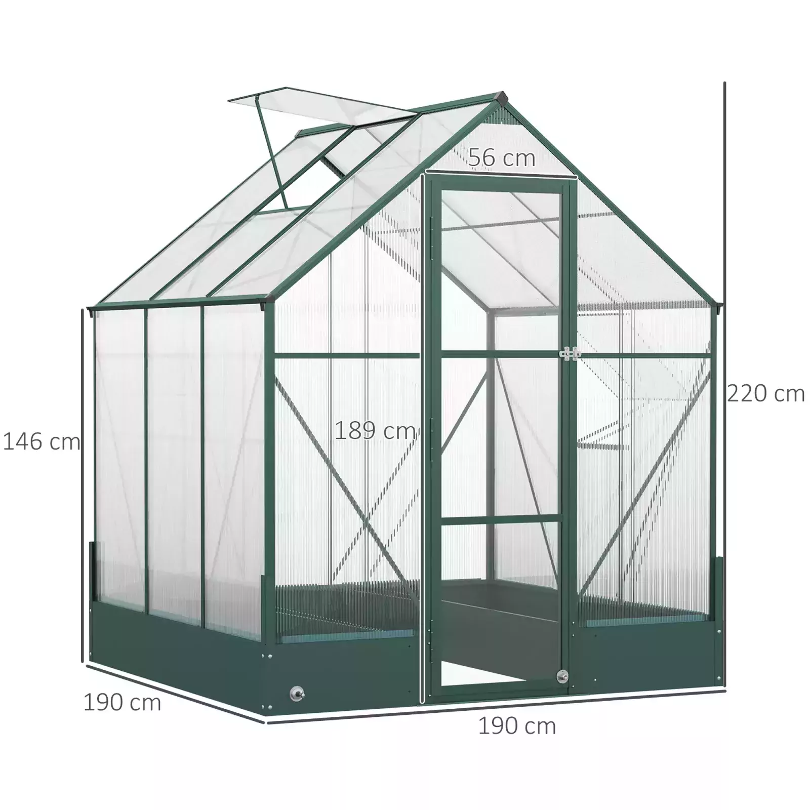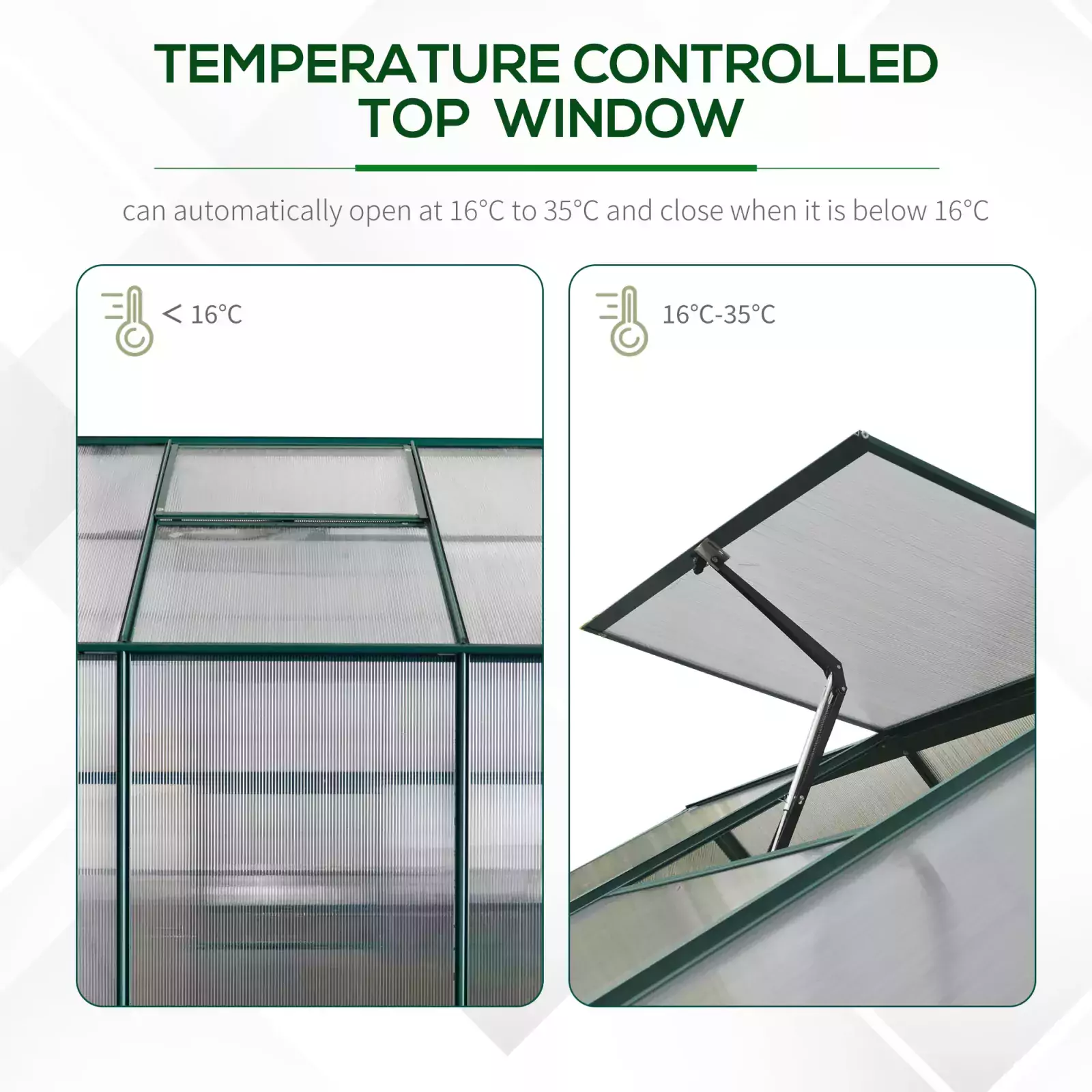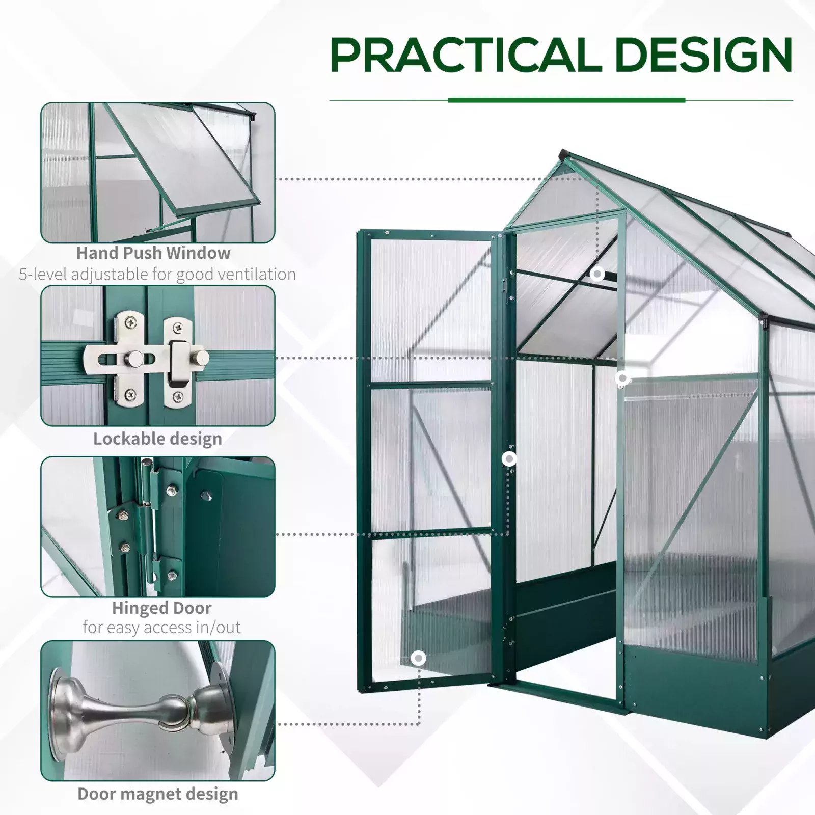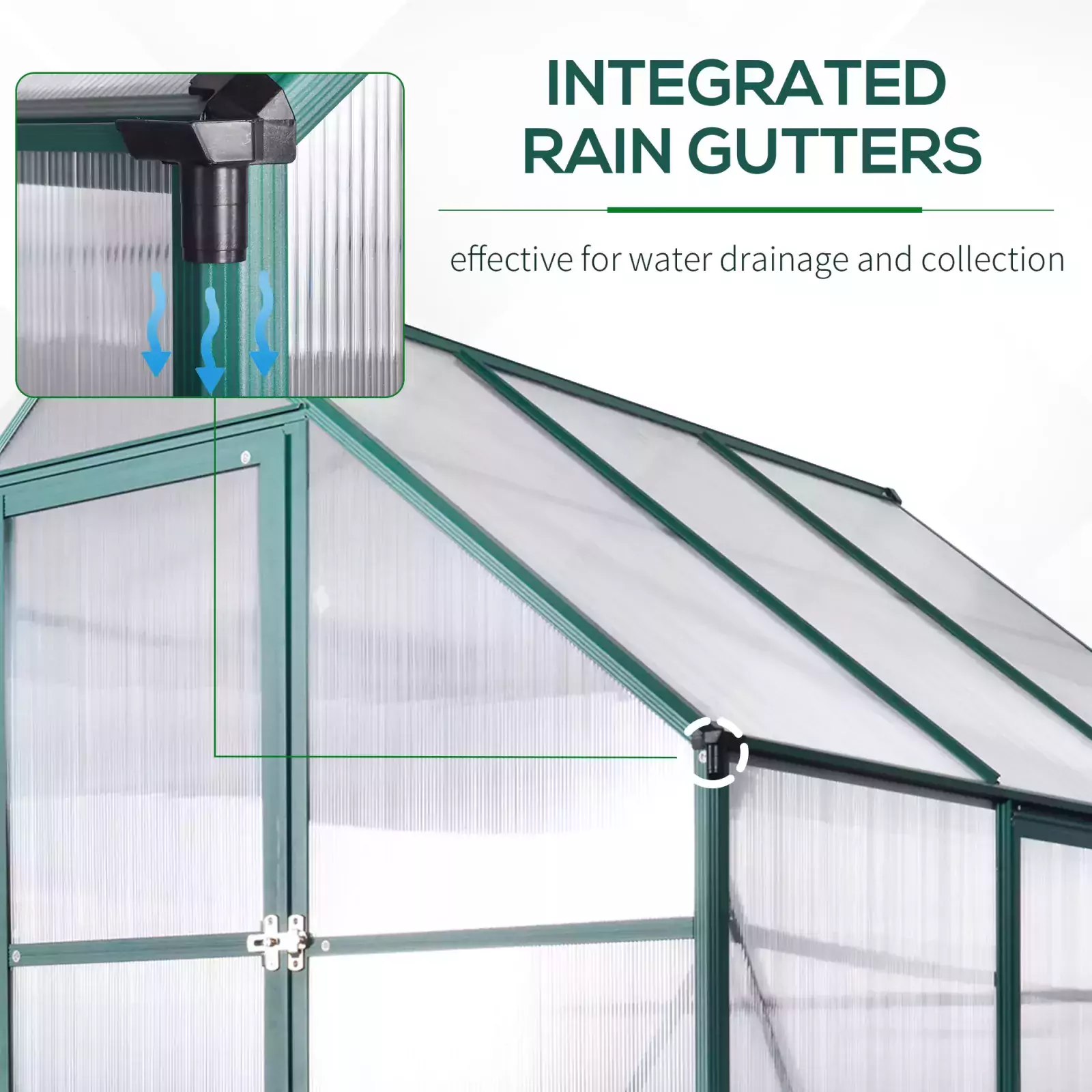- EASY ACCESS: Fitted with a hinged door and window which can be fixed to five different angles. Integrated rain gutters of the greenhouse polycarbonate are effective for water drainage and collection.