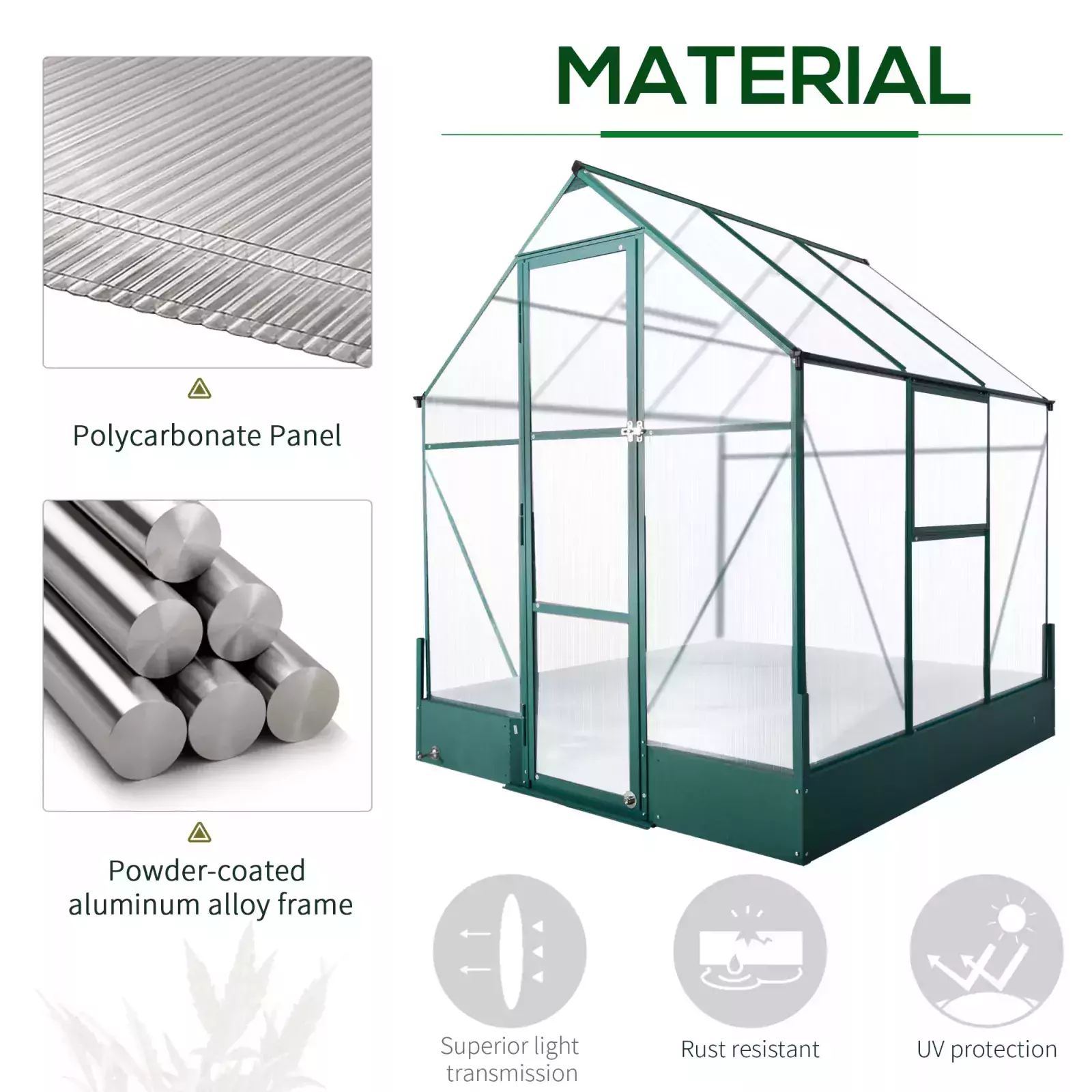 - ALUMINIUM FRAME: Naturally lightweight yet robust and resistant to rusting, it keeps the greenhouses for the garden structure in shape. POLYCARBONATE PANELS: Tough lean to greenhouse panels which keep the heat in and allow sunshine to pass through the hobby greenhouse. 30um resistance to protect your crops from harsh UV.