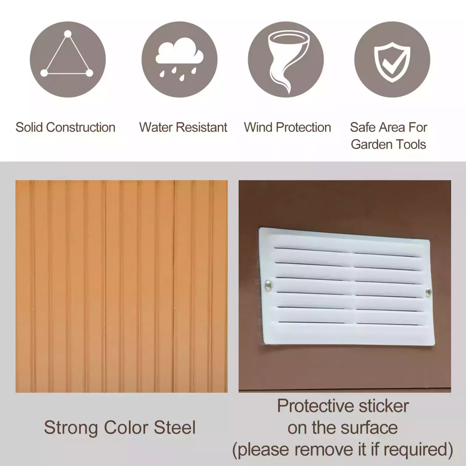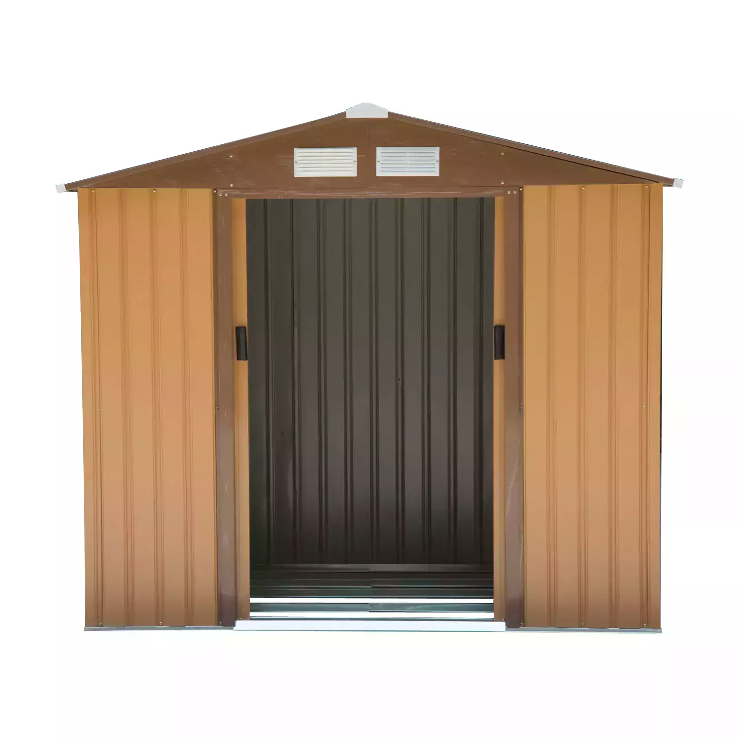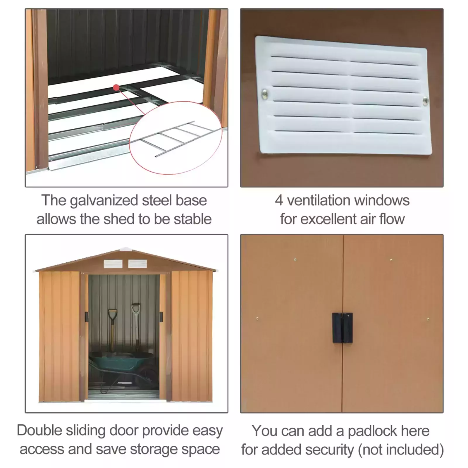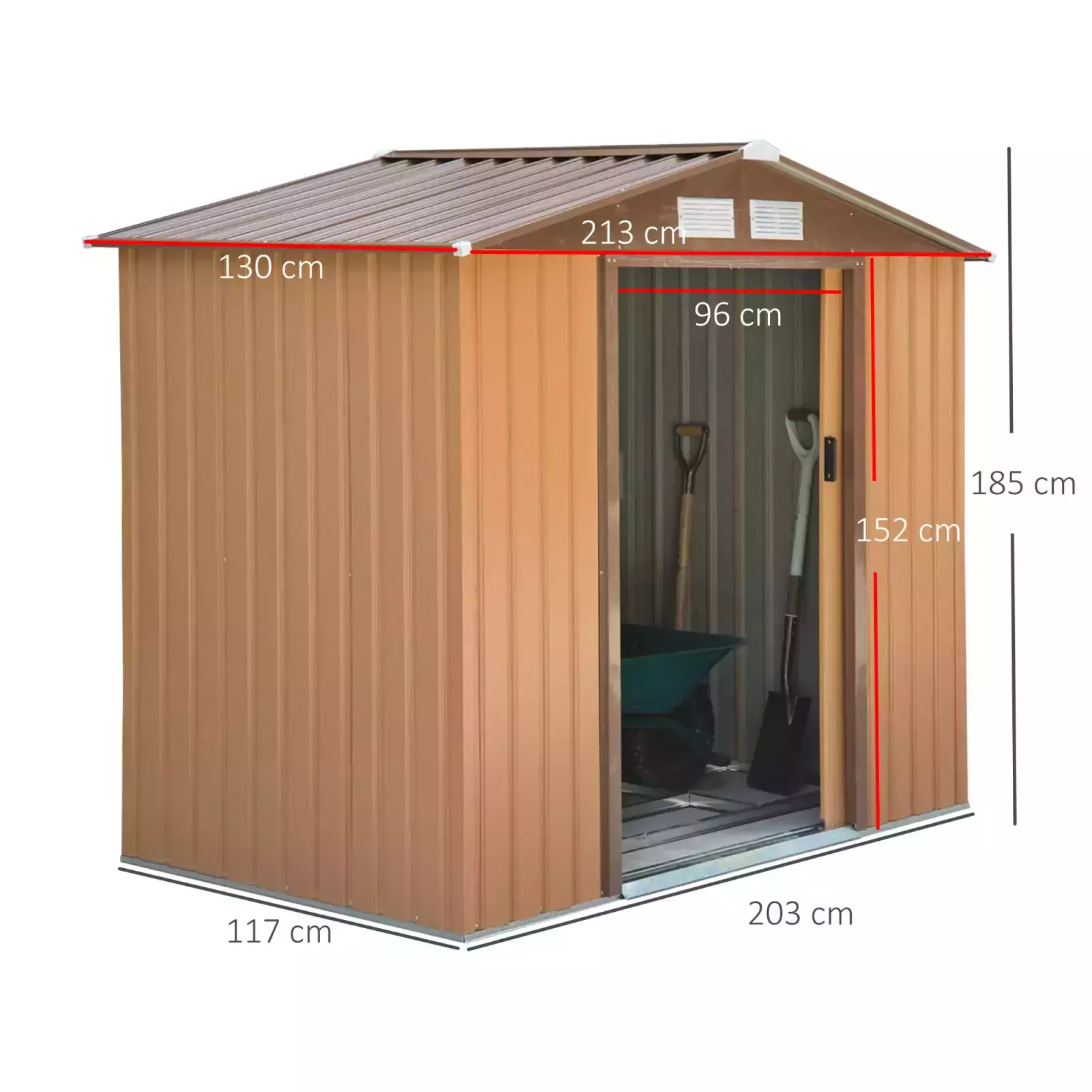 Built from galvanised steel for enduring reliability, it is made with a lockable double sliding door on the front for easy access, four vents for air to circulate and prevent moisture build up. The garden tool shed is finished with a protective weather coating and a floor foundation for it to stand level on the ground. The perfect outdoor sheds and garden buildings.