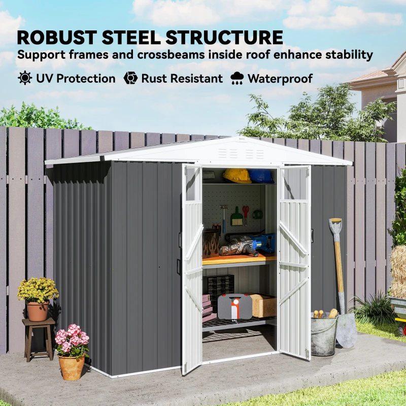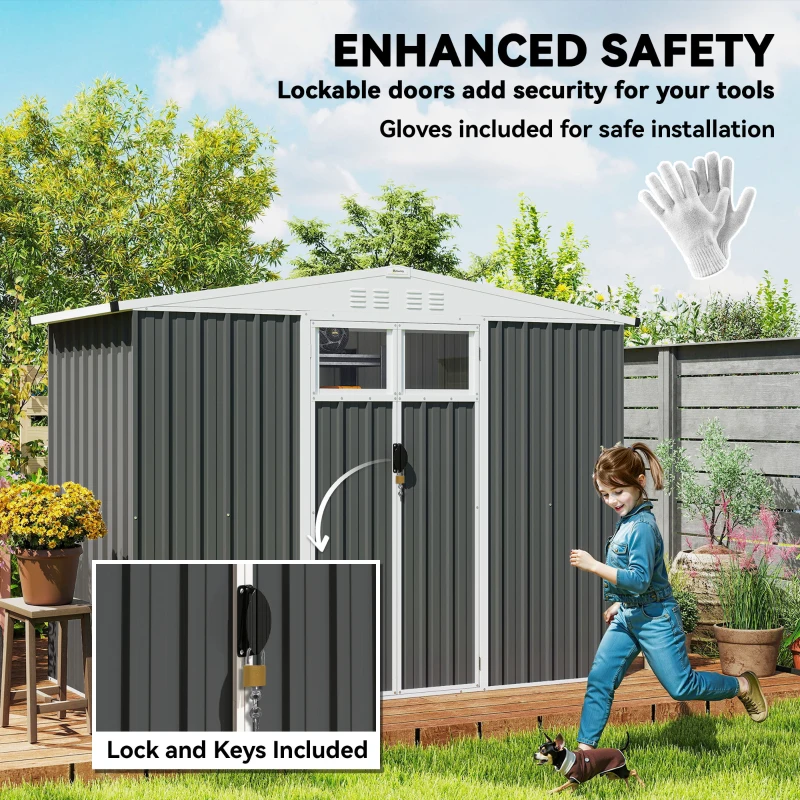 Secure & convenient access: Our metal shed features double doors for effortless entry and exit, complete with a reliable lock and keys to ensure your valuable items stay safe and sound.