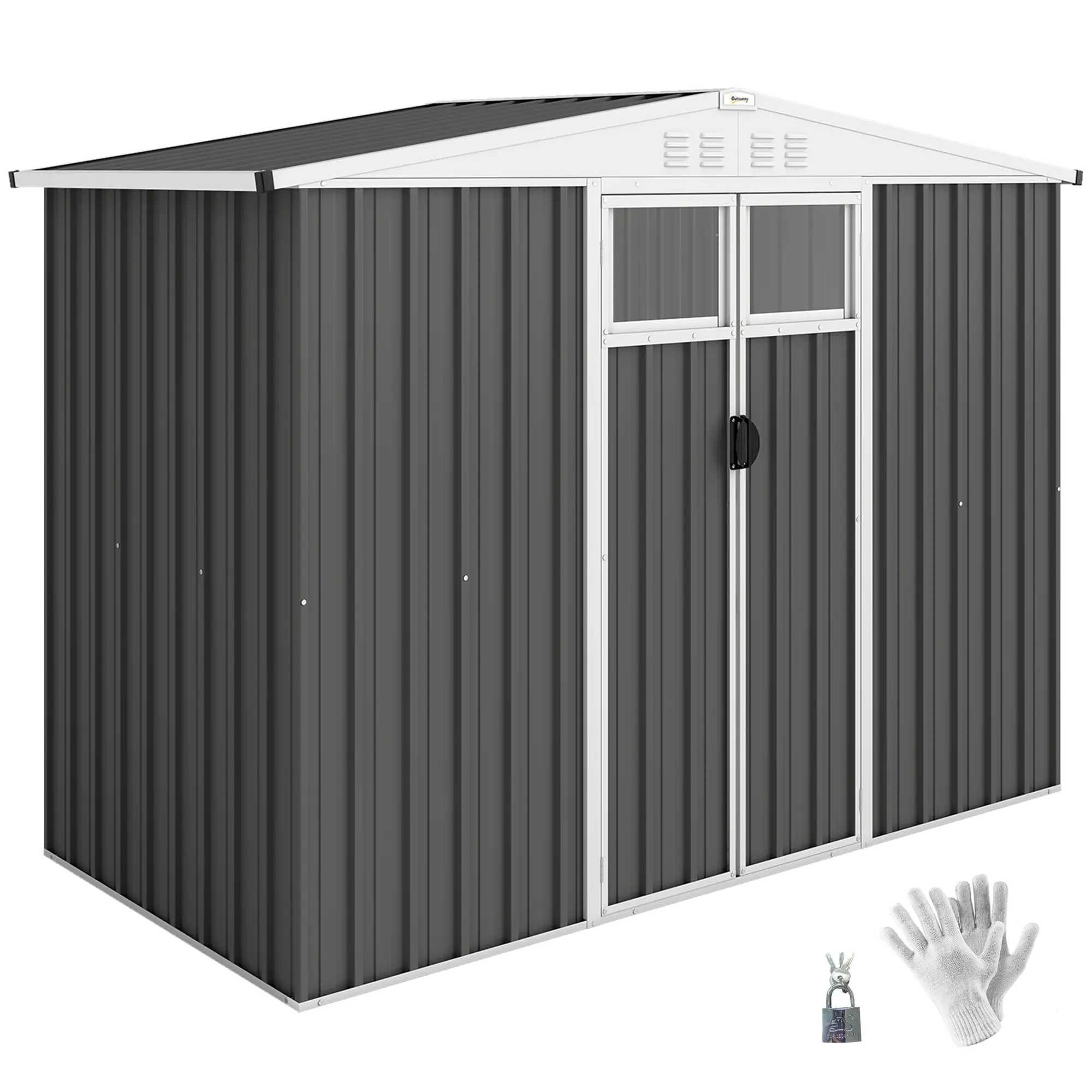 Discover the charm of tidiness with the Outsunny 8ft x 4ft Metal Apex Tool Shed – Dark Grey. Spaciously designed to house everything from bikes to garden tools, this garden shed features double doors for easy access and secure storage.