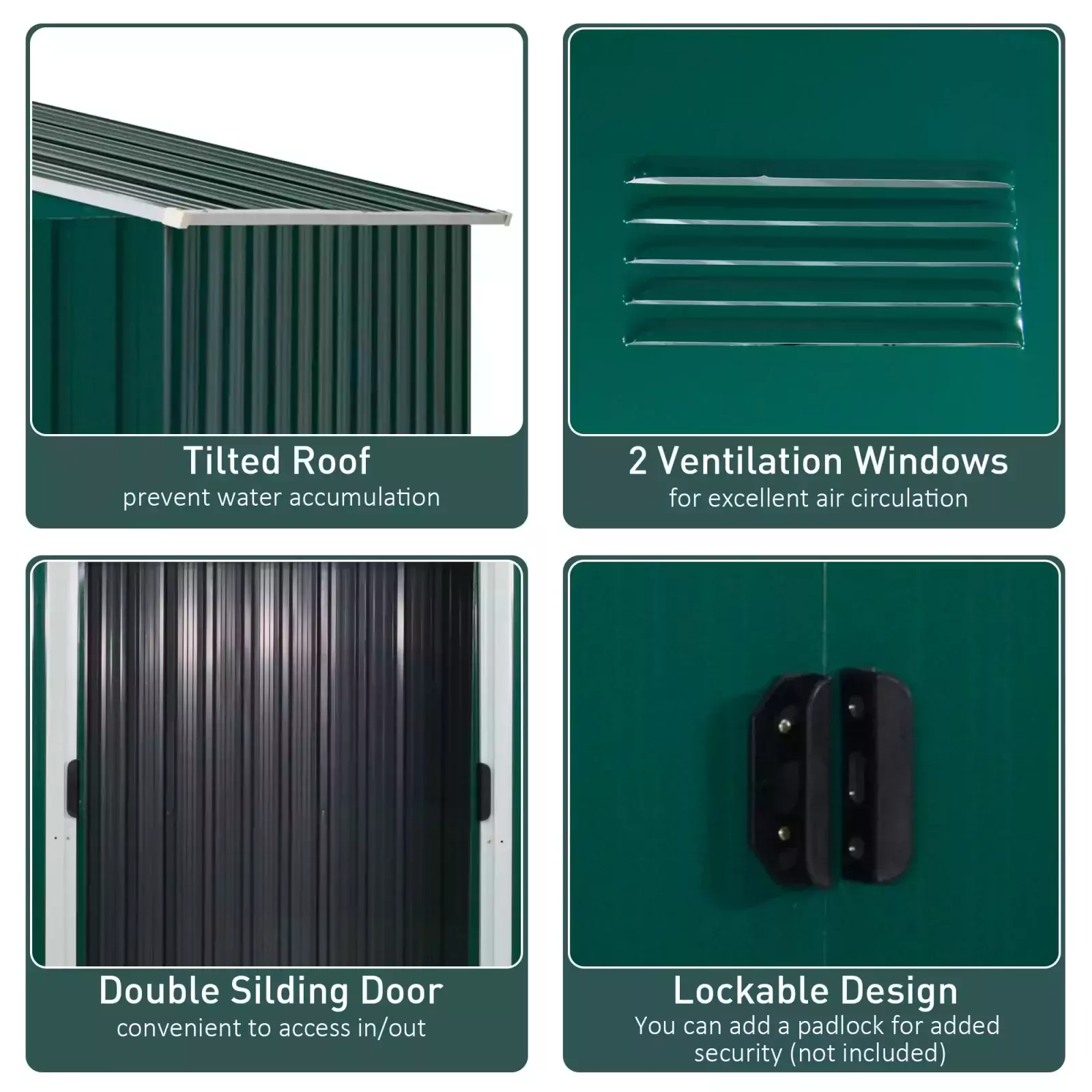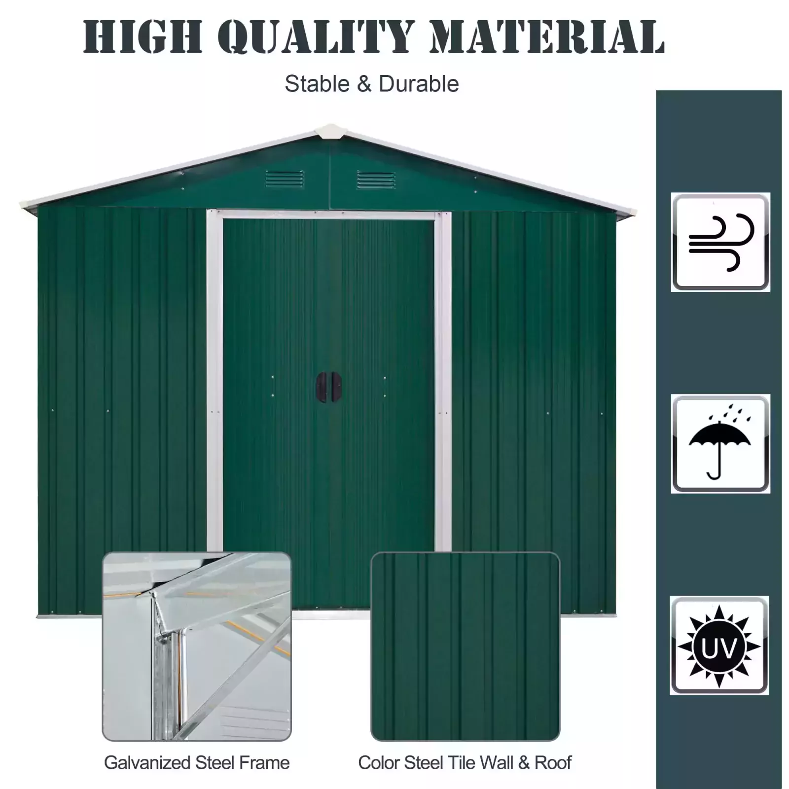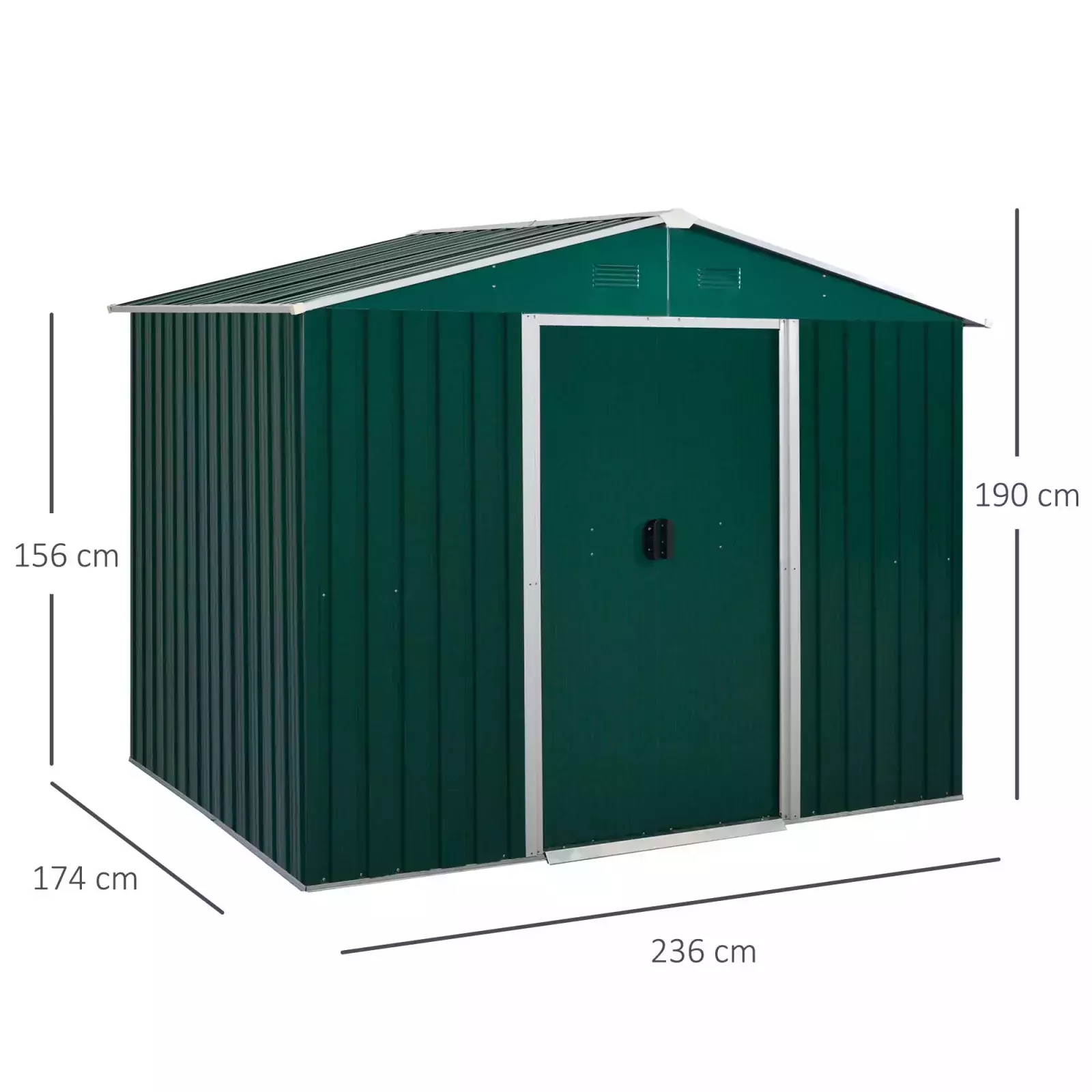 The Outsunny 8ft x 6ft Metal Garden Shed – Green is made of galvanized colour steel which is durable and resistant to corrosion.