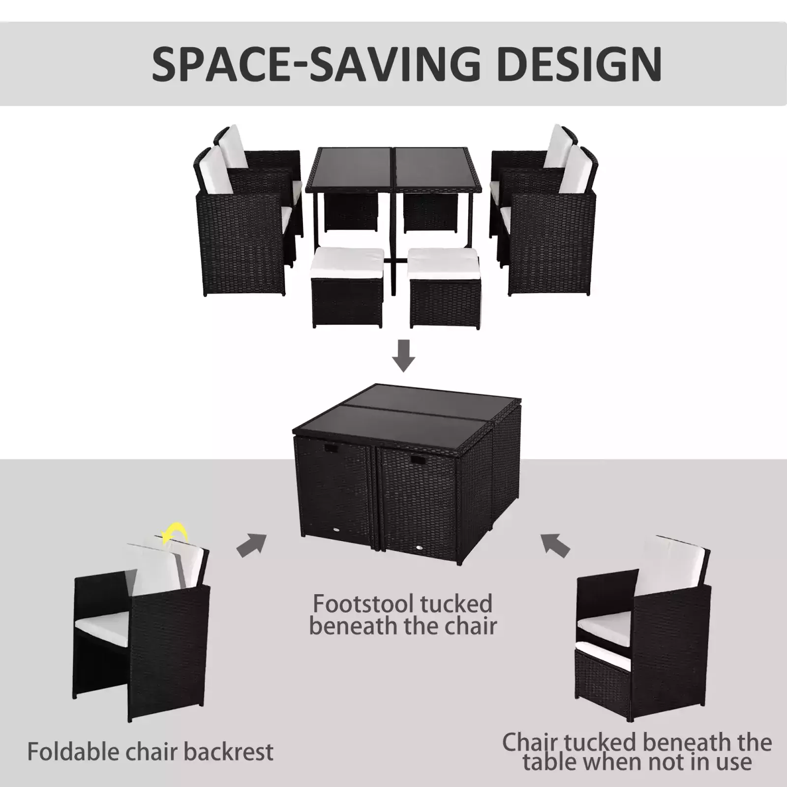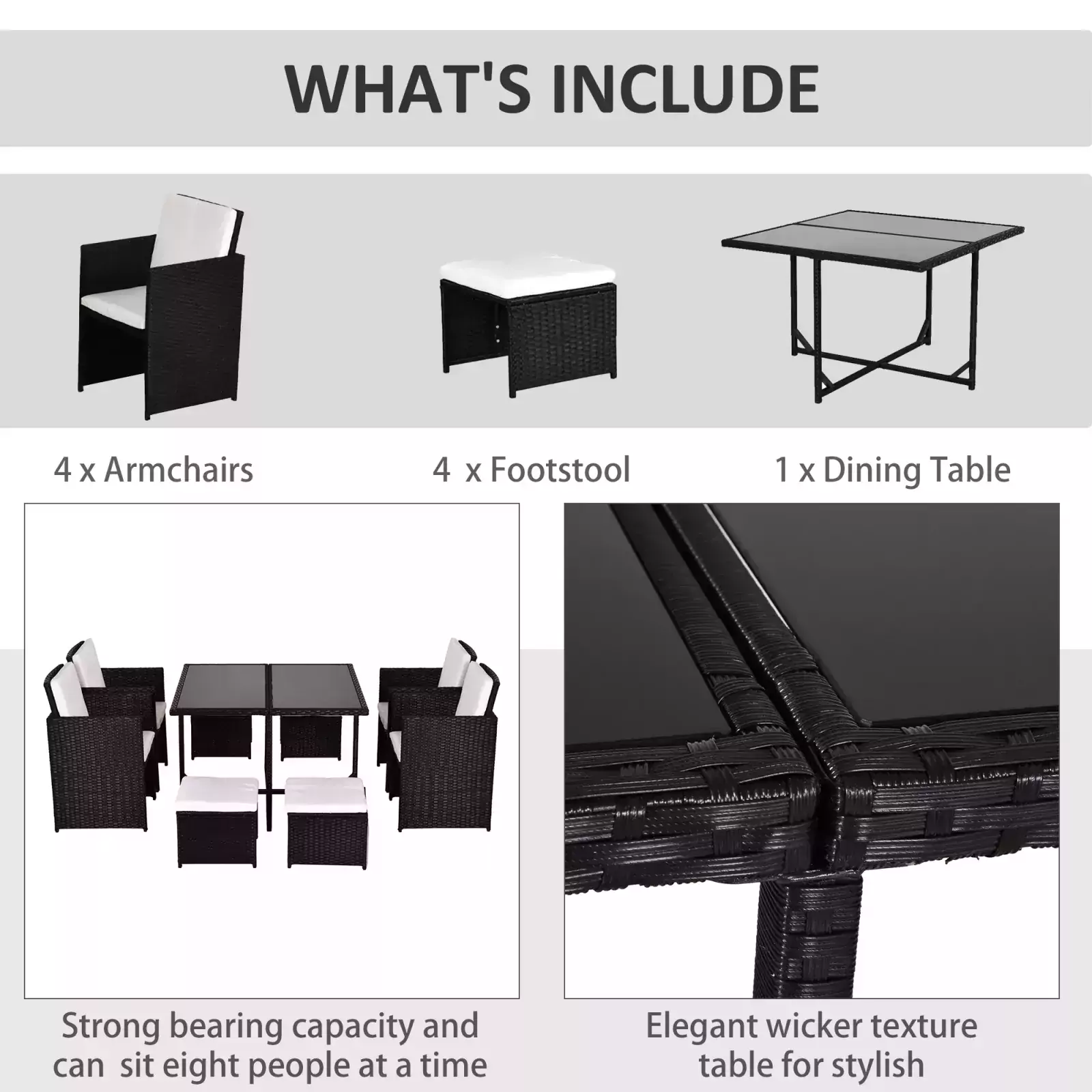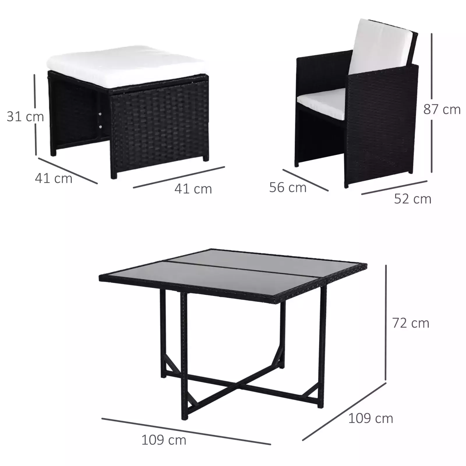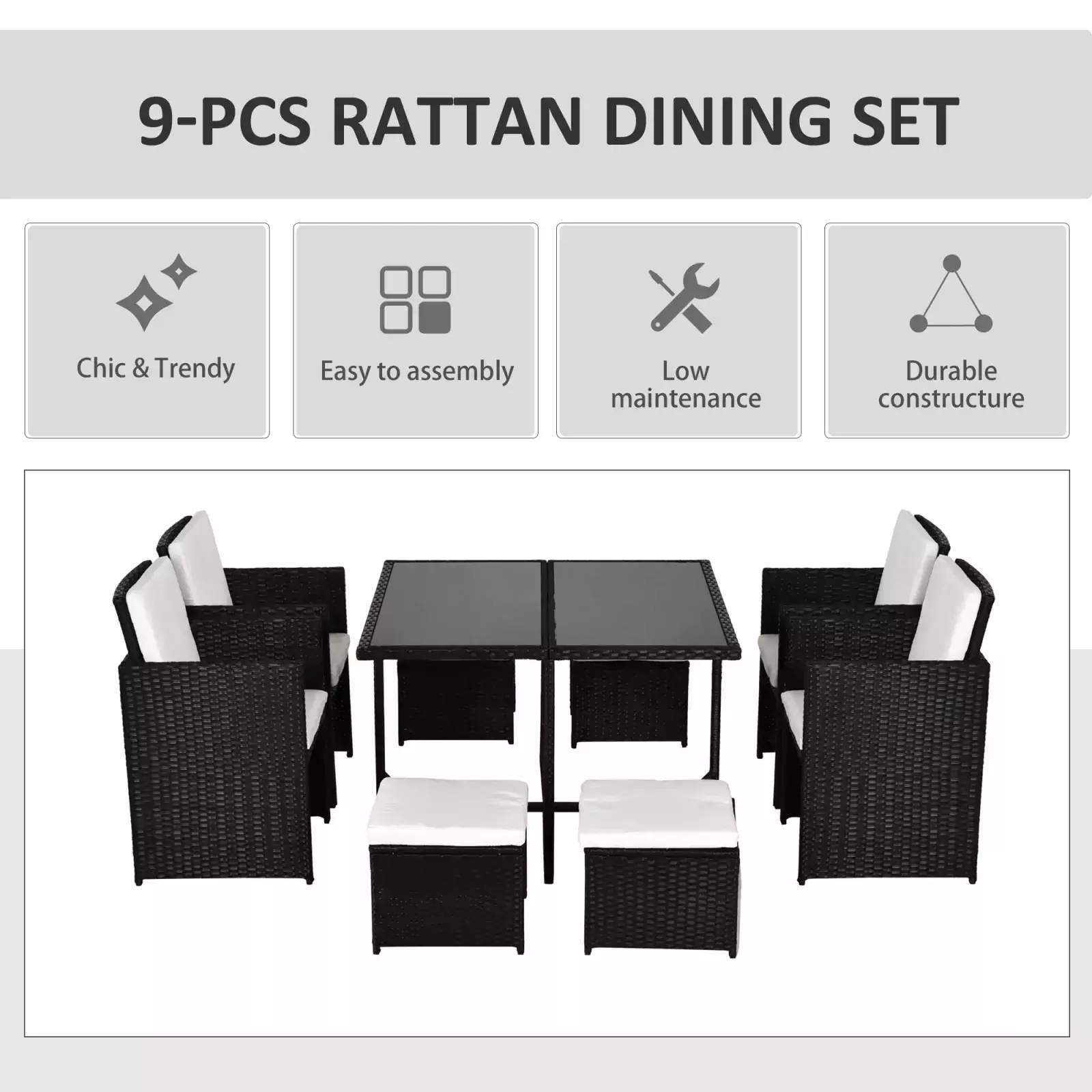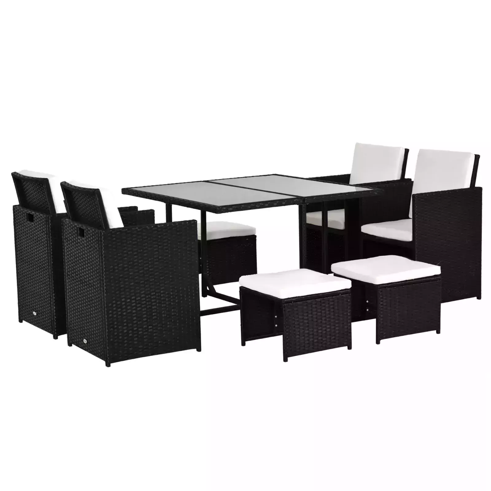 The Outsunny 9 Piece Rattan Outdoor Patio Dining Table Set – Black is a stylish and durable piece, made to make your days outside as comfortable as possible. The frames, made from metal ensure a tough structure – with the PE wicker rattan around it giving extra protection and durability. All seats come with a padded cushion for comfort. The table’s top is made from tempered glass, a safe, solid surface which is also beautiful. It’s time to enjoy your outdoor garden, anytime, once again.