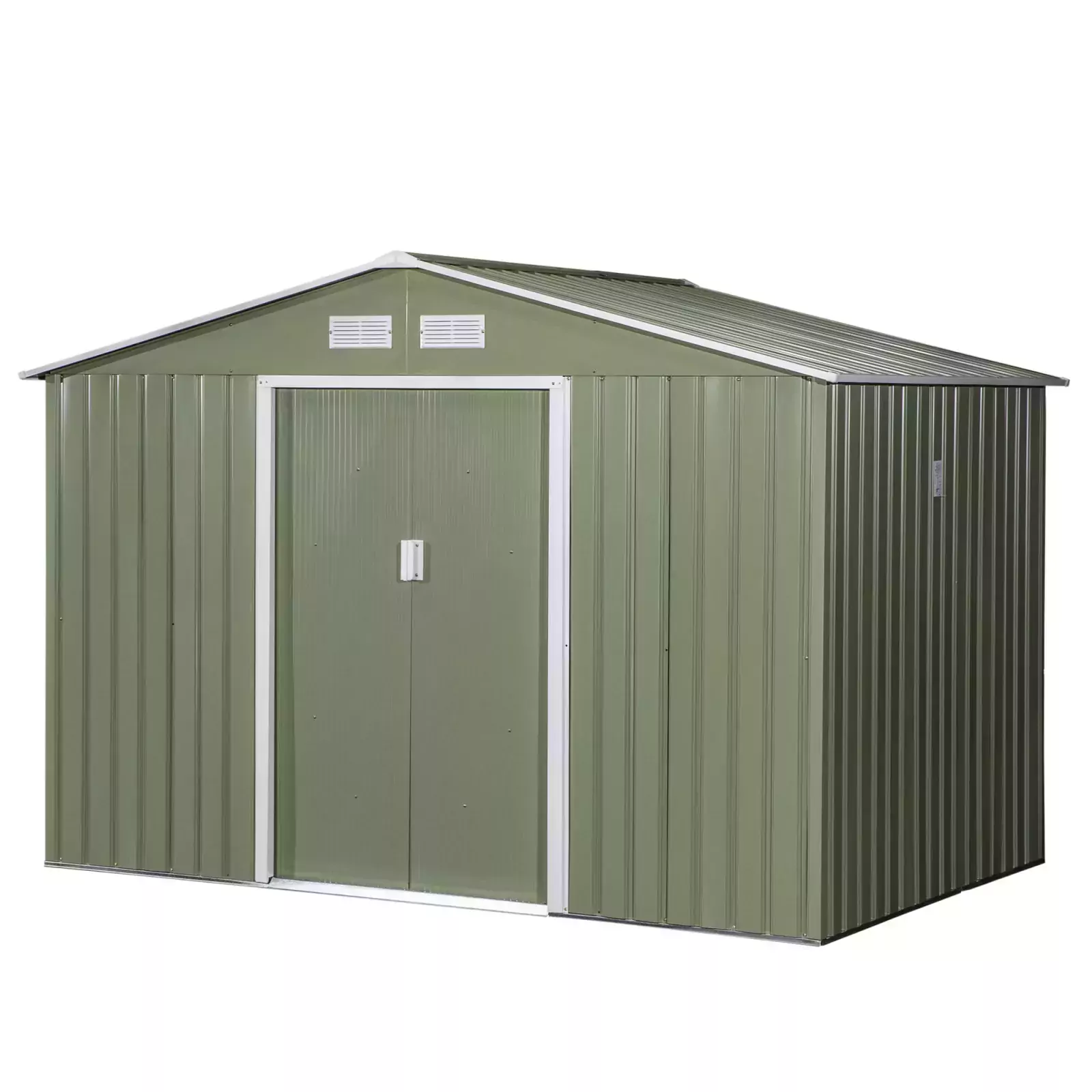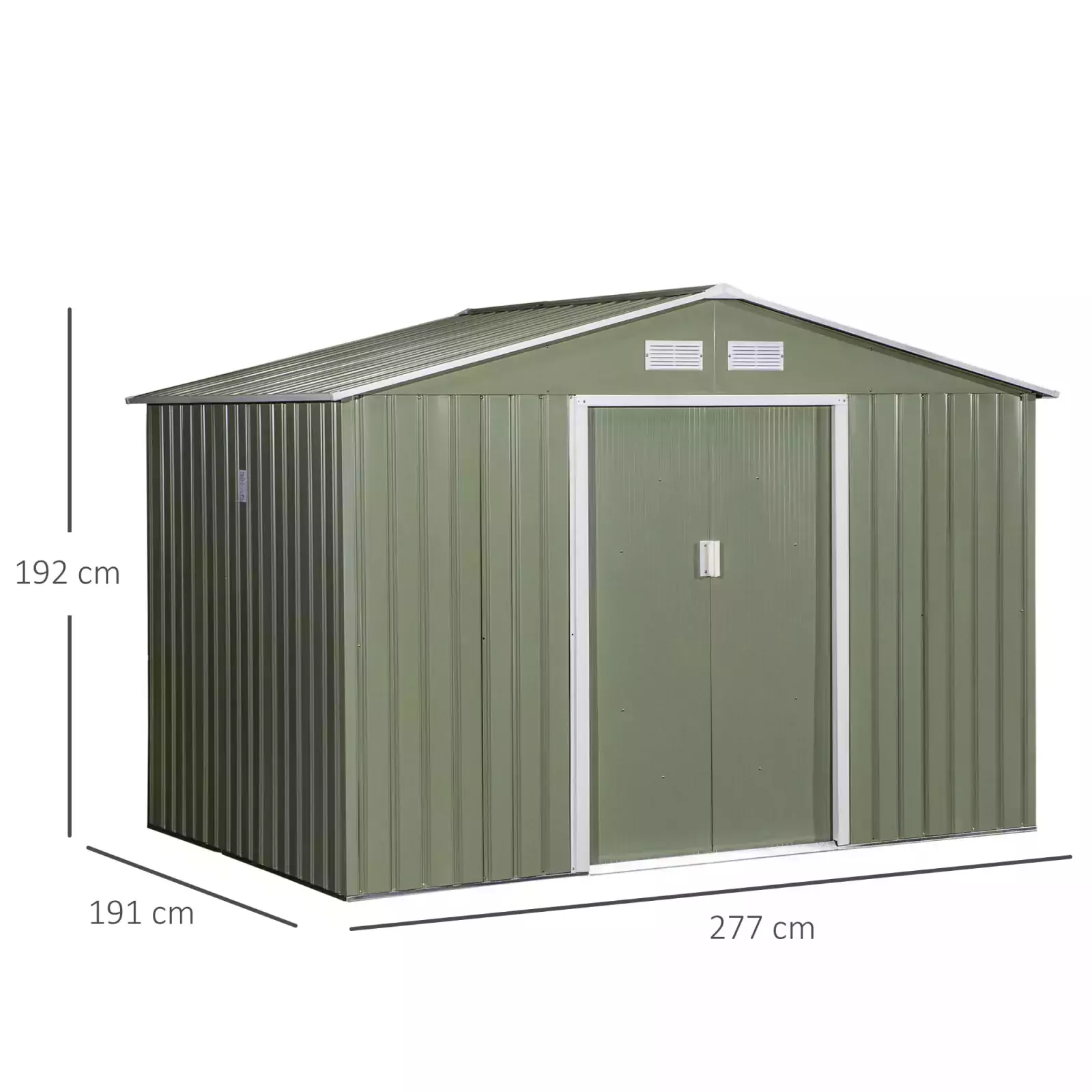 Keep your garden equipment and outdoor essentials locked away securely with this Outsunny 9ft x 6ft Metal Garden Shed – Olive Green with Foundation Grid from Outsunny.