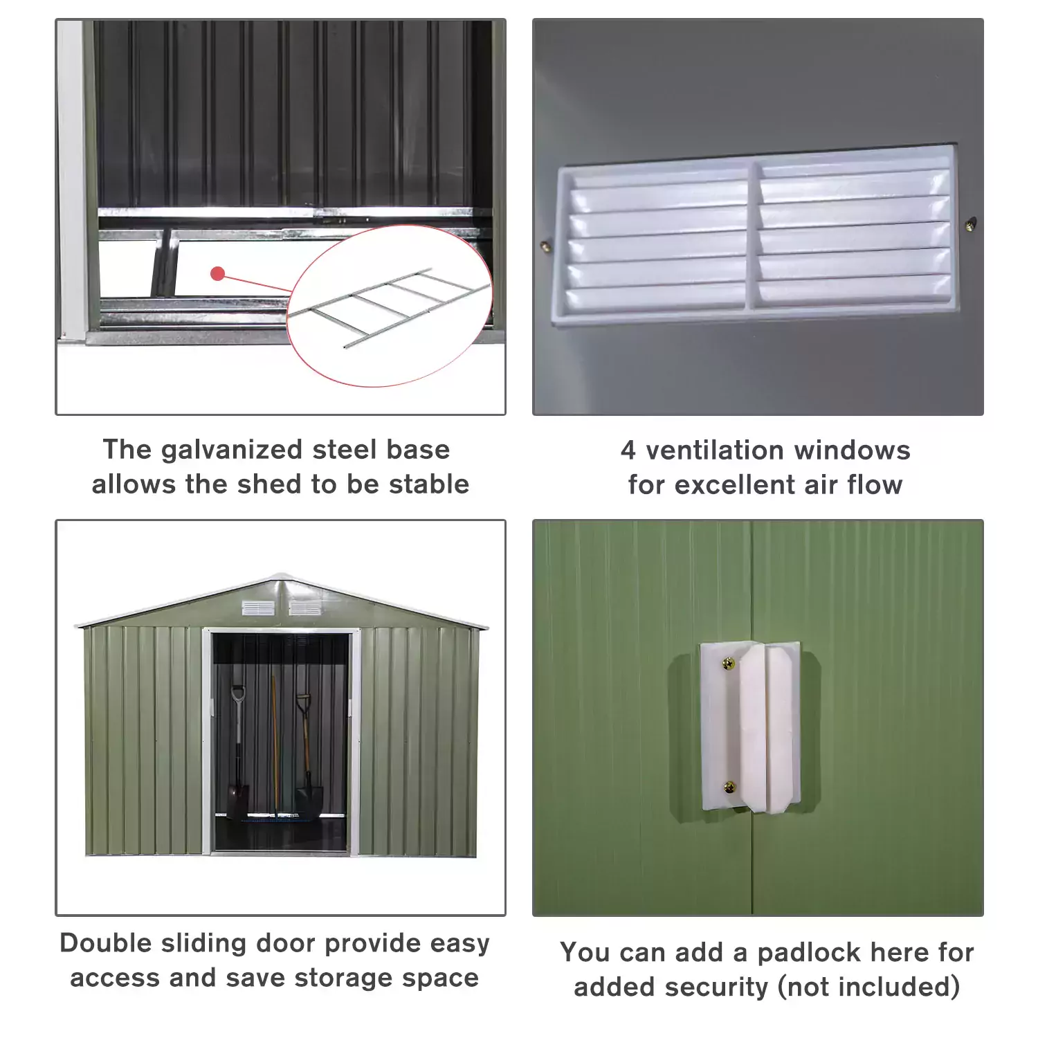 The Outsunny 9ft x 6ft Metal Garden Shed – Olive Green with Foundation Grid with Foundation Grid is an ideal solution to have in your garden, A great place to store tools, garden equipment, or any items you need to store. Made from metal and plastic components, and also has air vents for airflow. The whole structure is painted to blend in with surroundings. It can be used as a storage solution or as a work shed.
