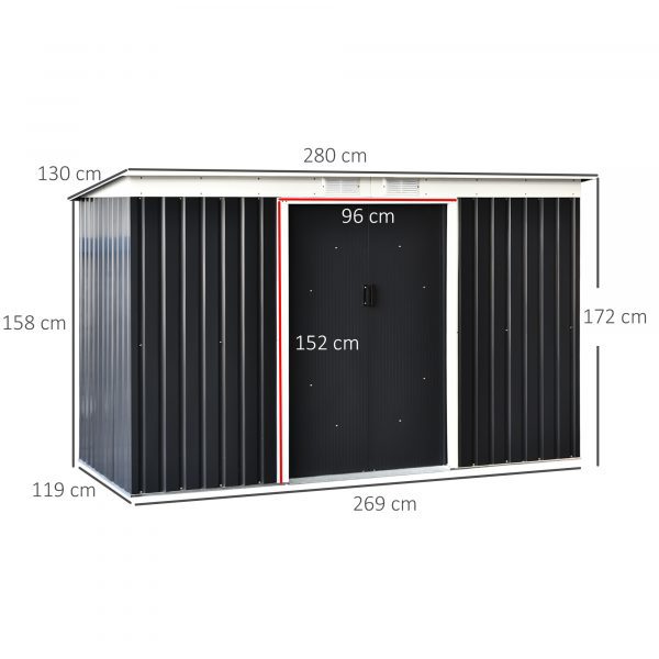 OUTDOOR STORAGE SHED DIMENSIONS: 280L x 130W x 172Hcm. Double Door Shed Inside: 266L x 116Wcm. Door: 96L x 152Hcm.