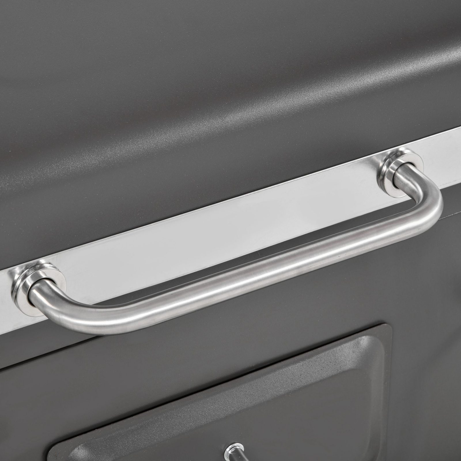 - Middle compartment for holding charcoal, with a secure door and stainless steel handle