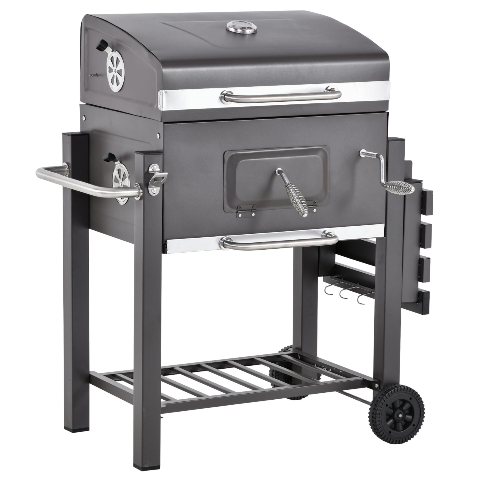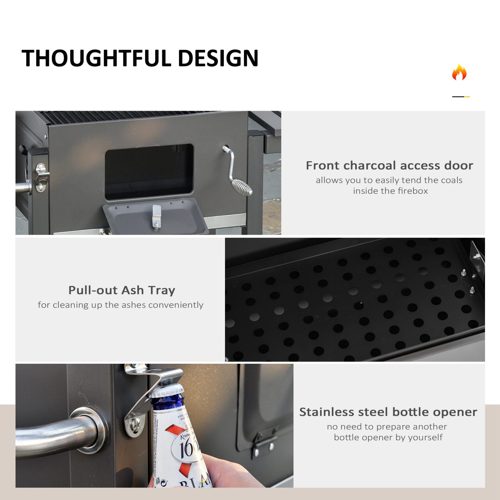 This Outsunny Charcoal Grill BBQ with Built-in Thermometer from Outsunny is the perfect choice for when family and friends Formed from steel with a powder coating to ensure reliability and strength, it is made into a deluxe design, multiple functions in a single BBQ grill. A stainless steel handle opens the lid safely, with the side handle adjusting the height of the charcoal burning for smoking control of the food. A wheel and side handle finish this piece, making the outdoor barbecue effortlessly easy to move around.