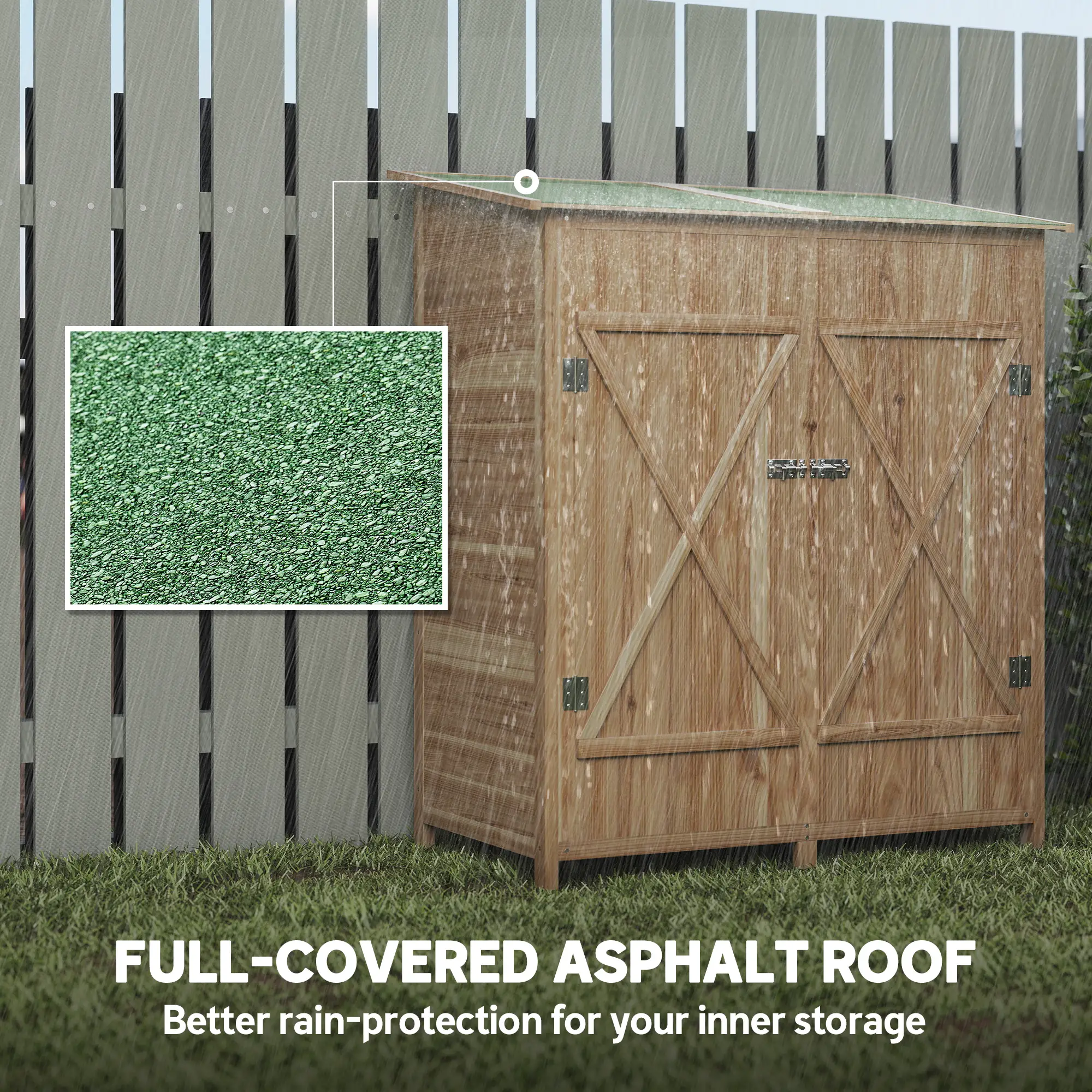 Asphalt roof: Roof of outdoor small garden shed is slanted to prevent water build-up, keeps inside dry during light and mild weather conditions.