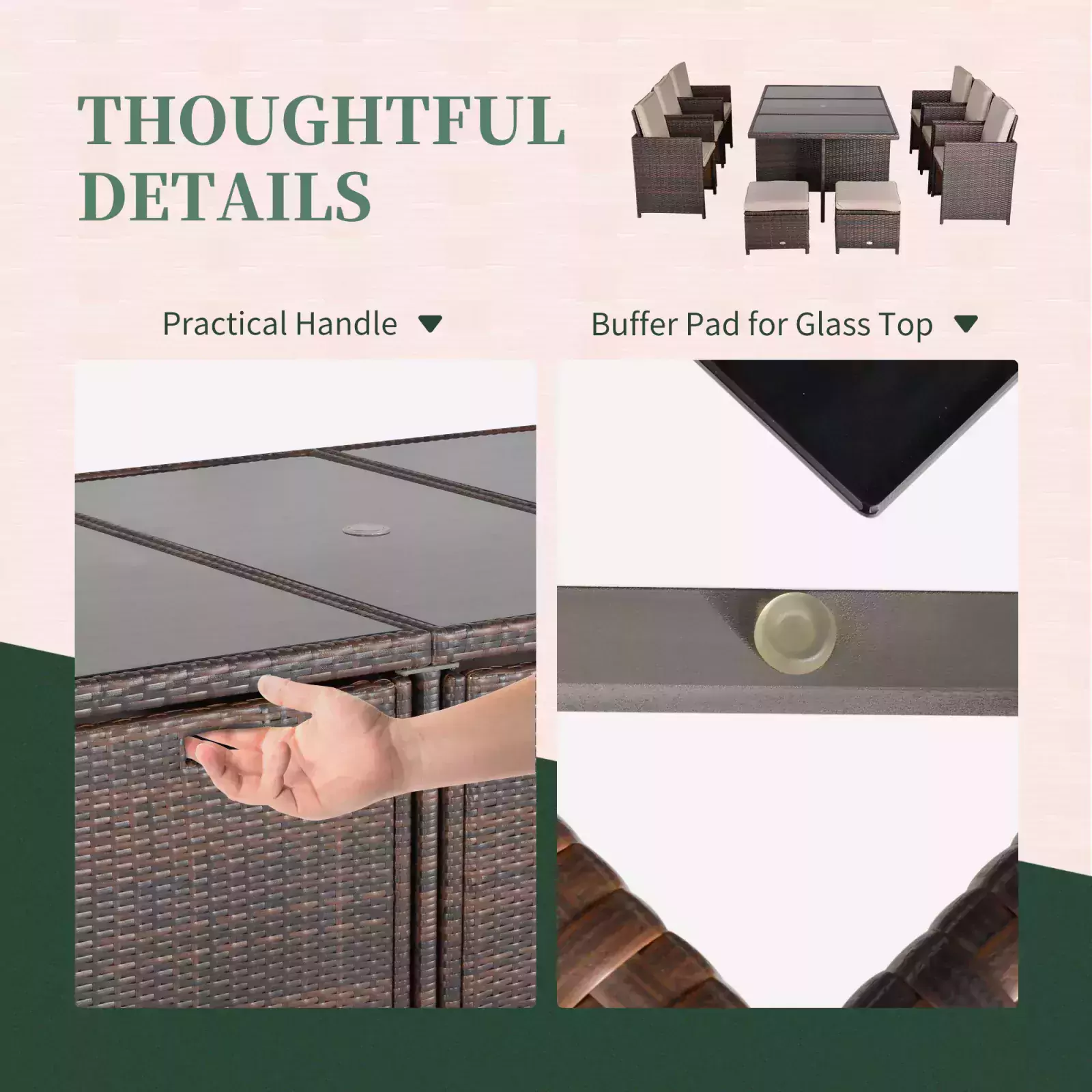 - RATTAN CUBE SET: This 11 pcs rattan dining set is modern design come with a large dining table with an umbrella hole in the middle, 6 armrest chairs, and 4 footstools. Seats and footrests can be concealed under the table when not in use