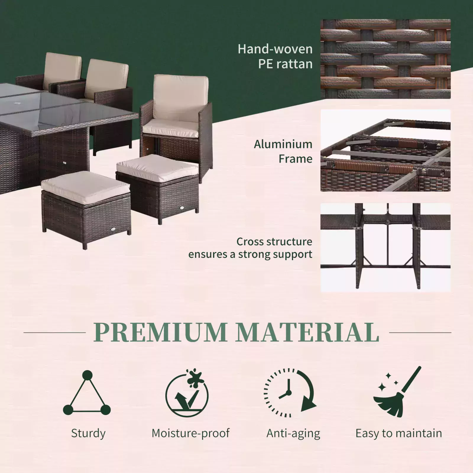 The Outsunny Outdoor 11piece Rattan Garden Furniture Patio Dining Set – Mixed Brown creates an inviting setting, ideal for patio, porch, poolside, and garden. The furniture set is designed from a beautiful wicker material on a reinforced aluminum frame. The wicker and tempered glass table looks very fashionable and creates a modern style for your outdoor living area. It is suitable for any occasion, family dinners, parties, and more.