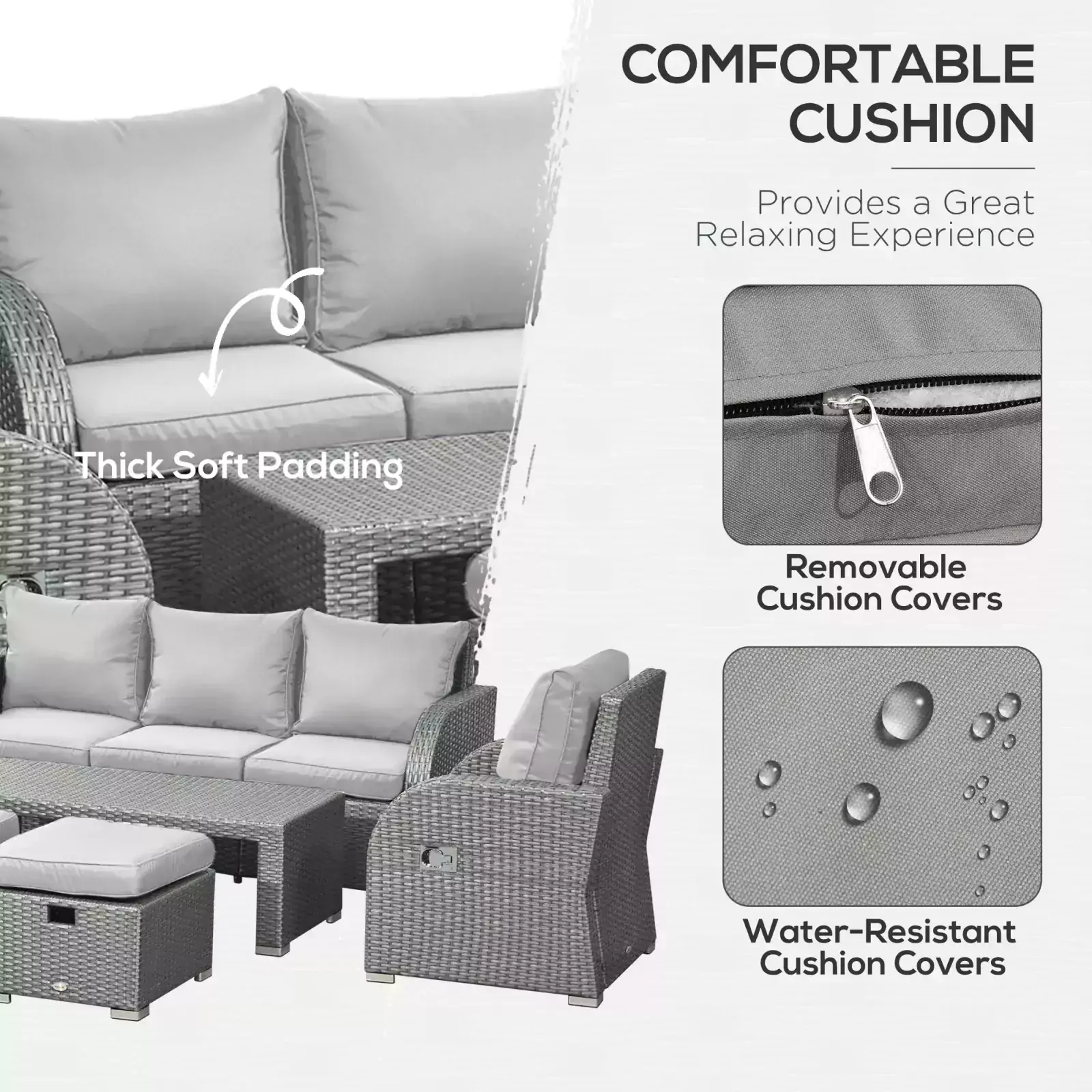 STEEL WRAPPED IN PE WICKER: Powder coated and rust-resistant steel ensures a strong and stable base, with the PE wicker making it sturdy, durable, easy to clean and resistant to UV and light water damage. PADDED CUSHIONS: Placed on the seats and backs of the chairs/sofa and on the footstool so you can sit comfortably all day long. Machine washable covers are resistant to light water and stains.