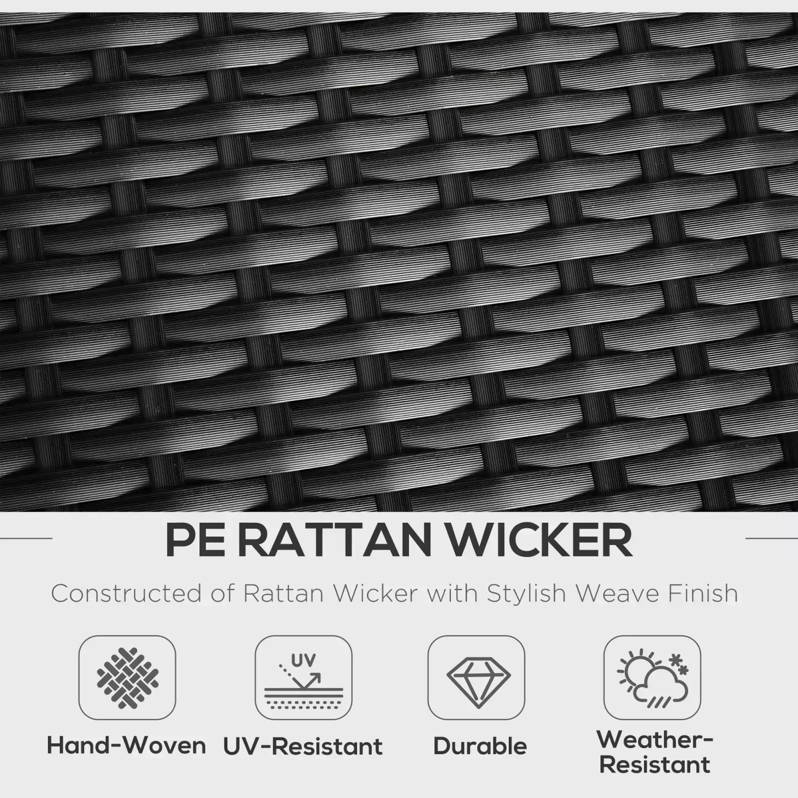 Powder coated steel frame for strength, wrapped in UV and water-resistant PE wicker rattan. Thick, foam padded seat cushions for enduring comfort as you sit and relax, with removable and washable covers. Anti-slip foot pads for balance and floor protection