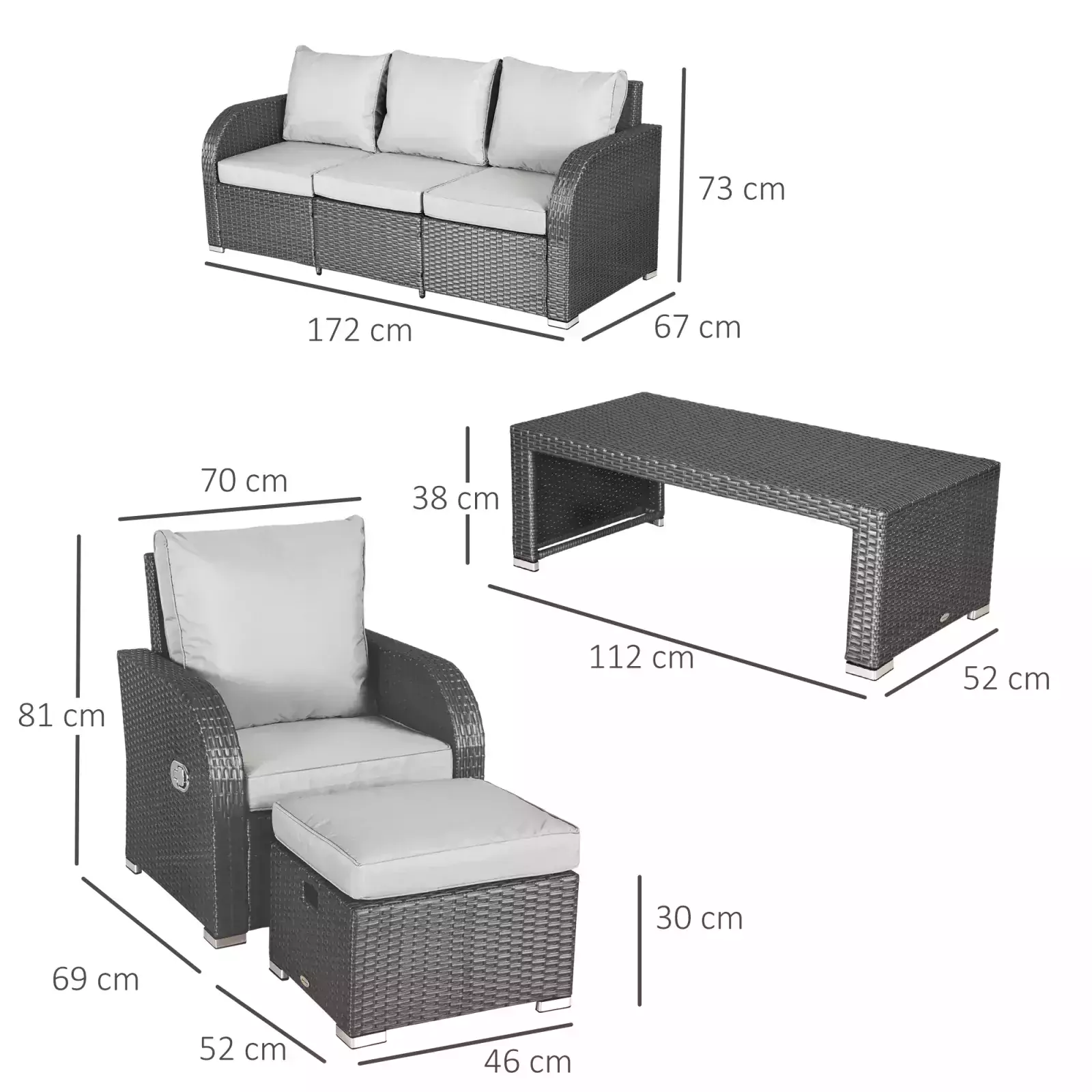 FOOT PADS: Keeps each piece balanced and stable, whilst protecting the floor beneath from damage. DIMENSIONS: Armchair: 81H x 70W x 69Dcm. Sofa: 73H x 172W x 67Dcm. Footstool: 30H x 46Lx 52Wcm. Table: 38H x 112L x 52W.