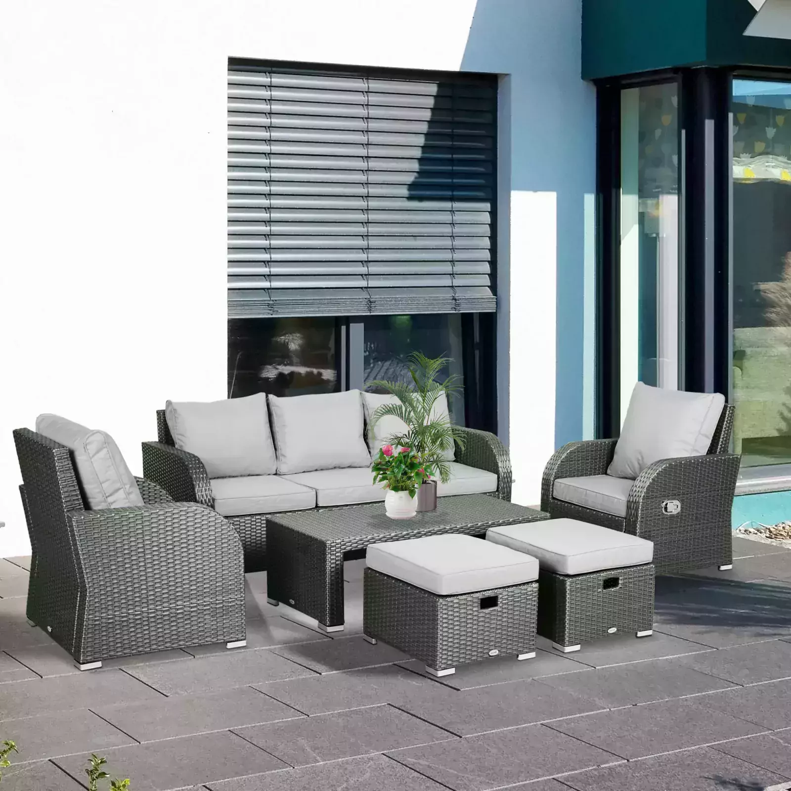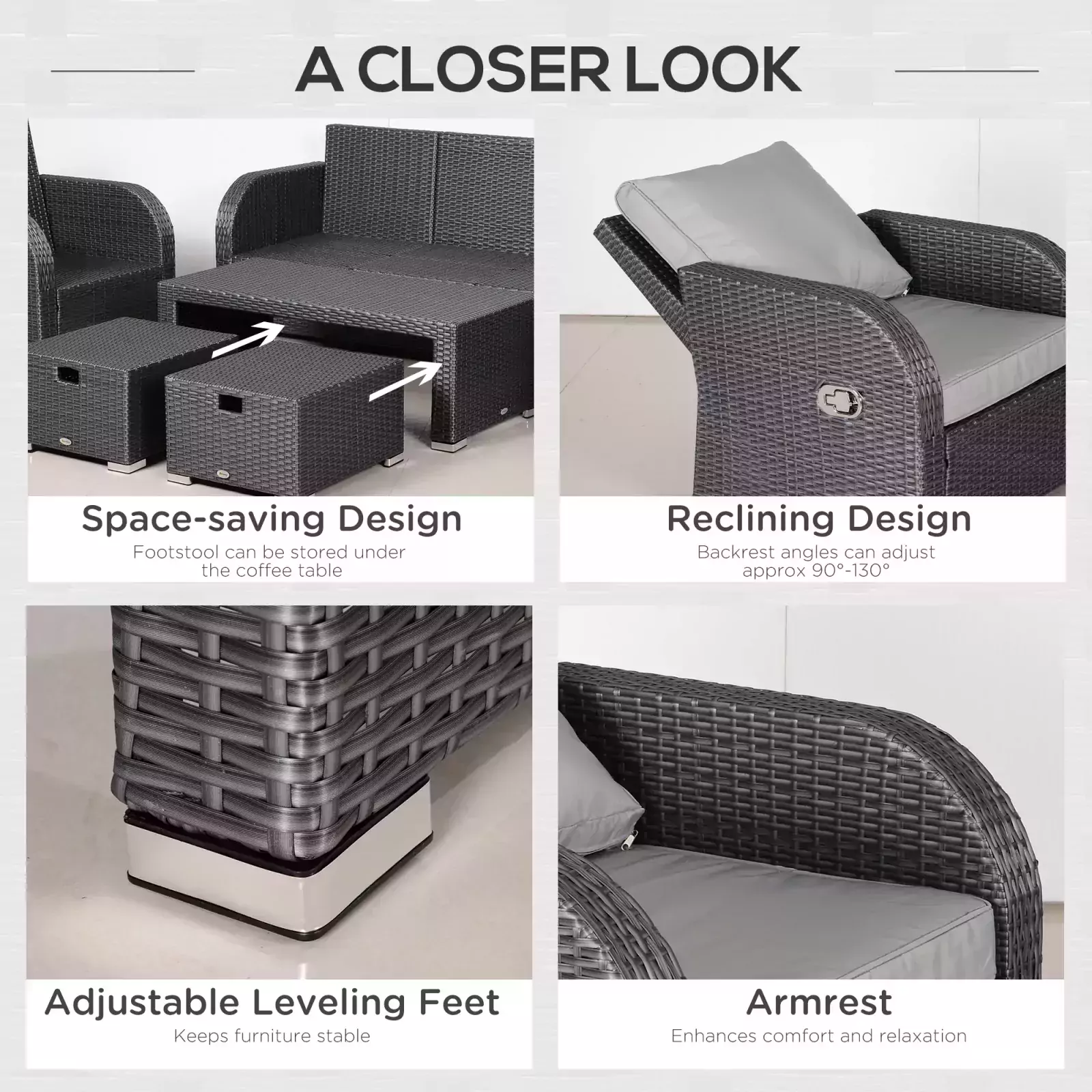 This Outsunny Rattan Garden Furniture 7 Seater Sofa & Coffee Table Set – Light Grey is the ultimate for satisfying relaxation in your garden. Using powder coated steel for a robust and sturdy frame, each of the two armchairs, three-seater sofa, two footstools and table is wrapped in PE wicker, which protects against mild weather-damage. Manually operated, both the armchairs in this set feature a reclining back, adjustable between 90 and 130 degrees, with thick padded cushions placed on the seats and back of all chairs for you to sit comfortably all day long.