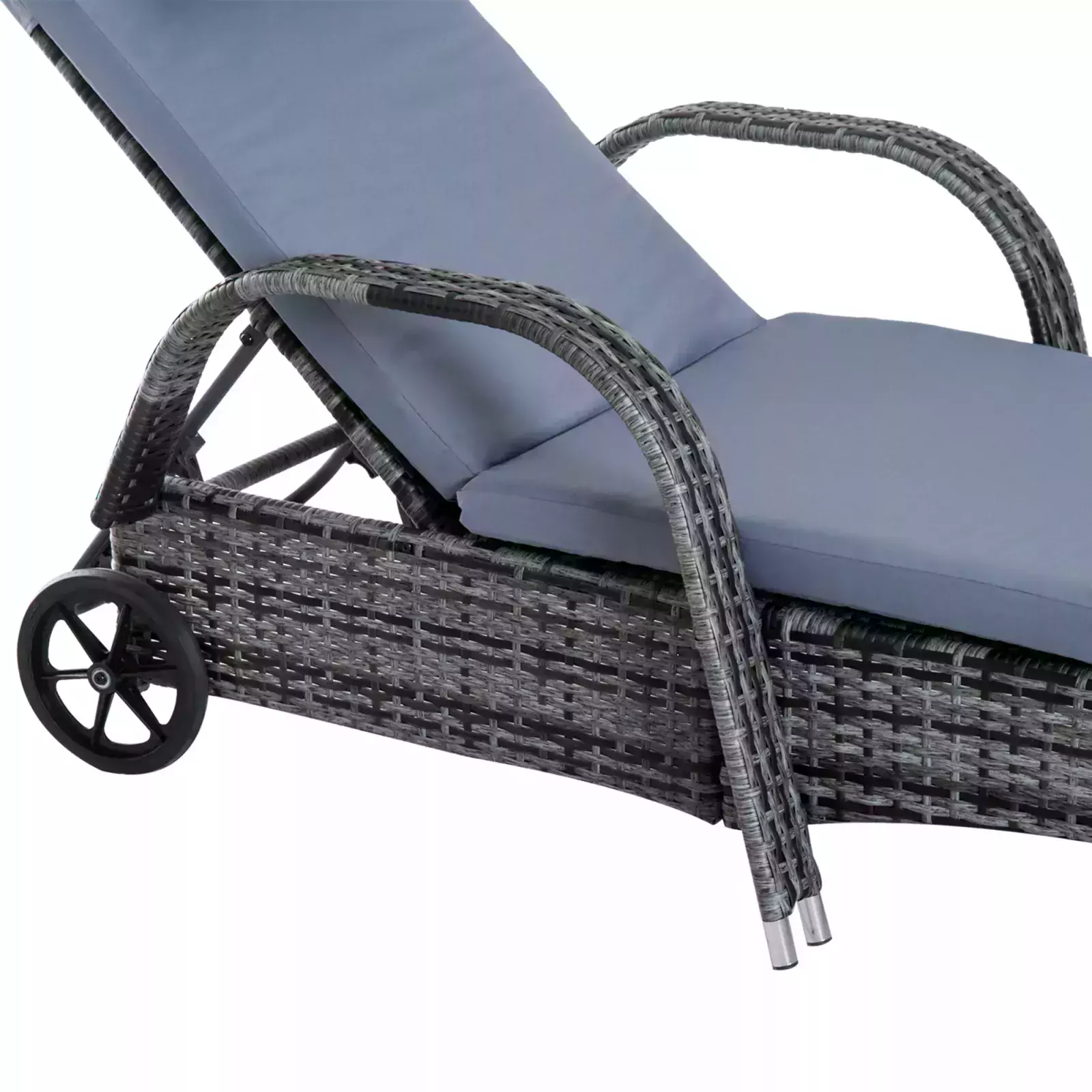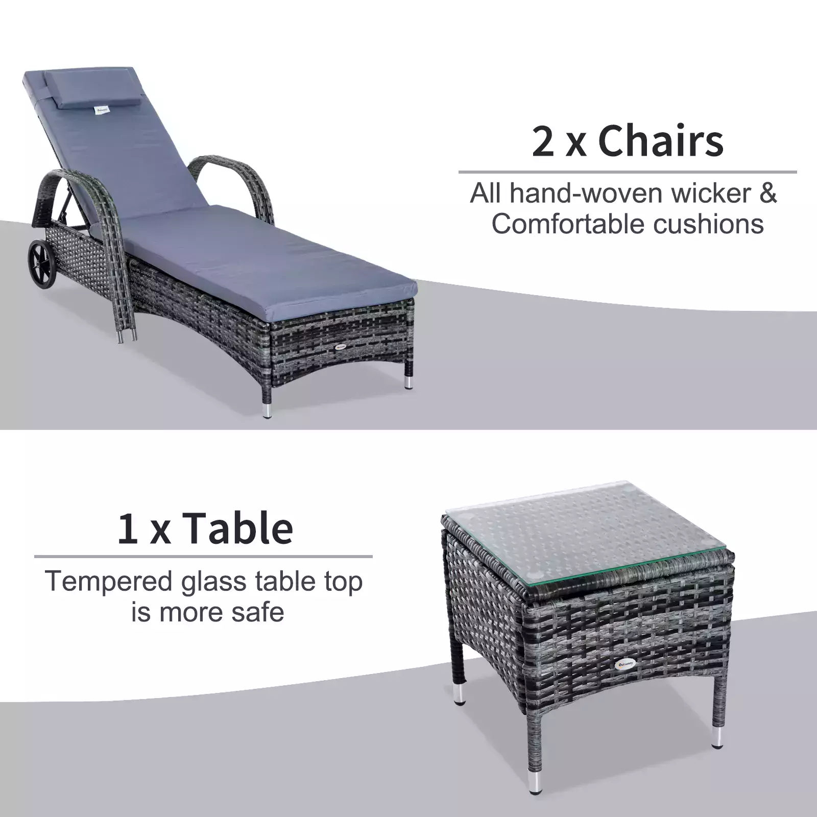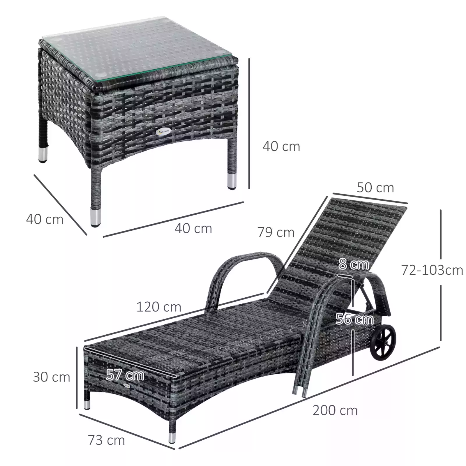 The Outsunny Rattan Patio Chaise Lounge Set- Grey comes complete with 2 loungers, 1 side table and cushions. The seat has 5 adjustable positions to give maximum relaxation and comfort. The side table also has a glass top to keep your drinks at easy reach, and the set can be used indoors and outdoors.