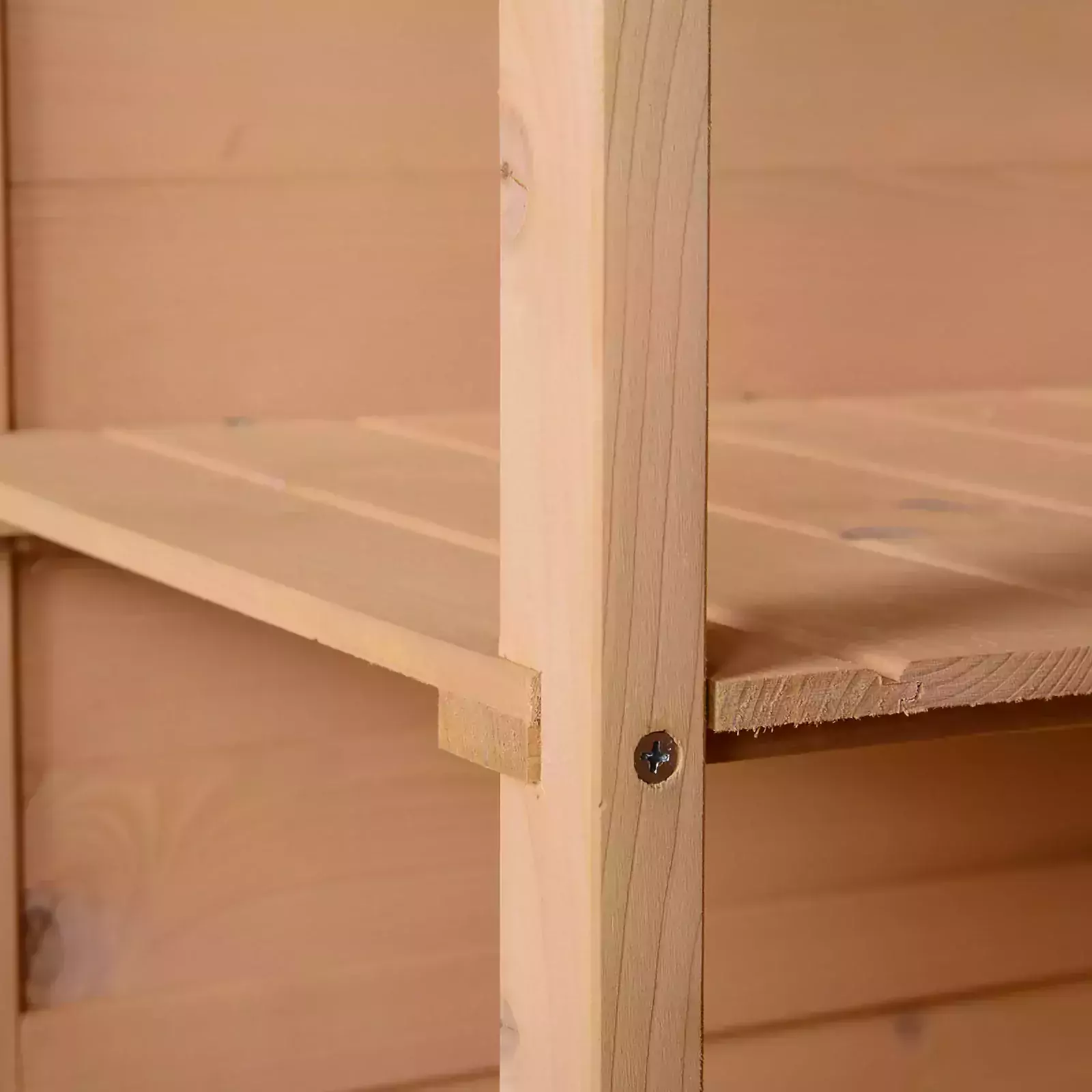 - Two shelves on the left for organisation, with an open right side for bulkier items Front door with a bolt latch for easy access and security
