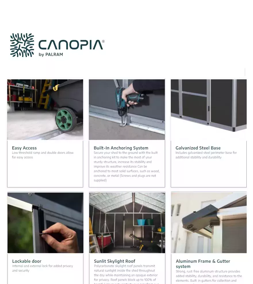 Built with ultra-resilient polycarbonate panels, this shed is designed for multi-functionality and years of superior protection. The panels are long-lasting and durable and are resistant against fracturing, discolouration or becoming brittle over time.