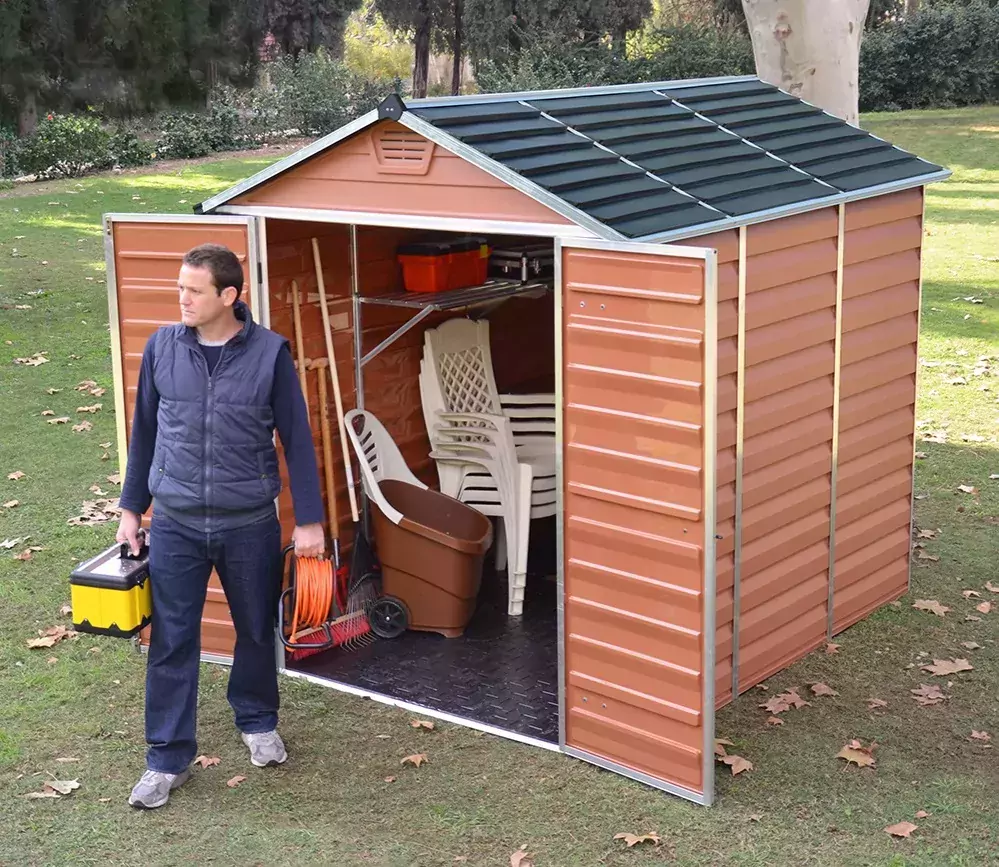 The Skylight garden storage shed is made with a reinforced aluminium frame and flexible polycarbonate panels specially engineered to withstand the expansion and shrinkage associated with weather changes. The panels do not bend, fracture, or discolour over time, giving your things maintenance-free protection for years to come. The unique Skylight roof panels transmit natural sunlight during the day while giving you opaque external visibility for maximum privacy as well as front and back vents for ample airflow. Designed with your outdoor living needs in mind, the Skylight plastic shed will complement your home, enhance your outdoor living space, and organize and protect your things.