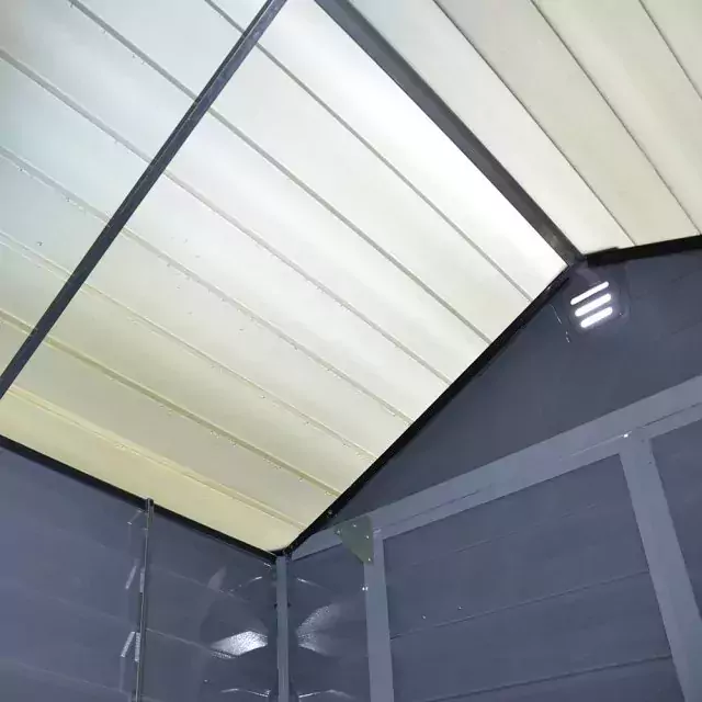 The Skylight garden storage shed is made with a reinforced aluminium frame and flexible polycarbonate panels specially engineered to withstand the expansion and shrinkage associated with weather changes. The panels do not bend, fracture, or discolour over time, giving your things maintenance-free protection for years to come. The unique Skylight roof panels transmit natural sunlight during the day while giving you opaque external visibility for maximum privacy as well as front and back vents for ample airflow. Designed with your outdoor living needs in mind, the Skylight plastic shed will complement your home, enhance your outdoor living space, and organize and protect your things.