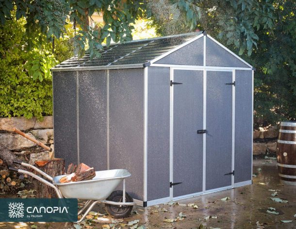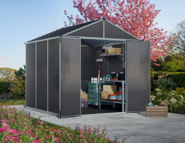 The Palram 8×8 Canopia Rubicon Double Door Plastic Shed – Dark Grey provides unbeatable weatherproof protection for your tools and equipment.