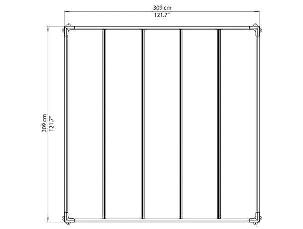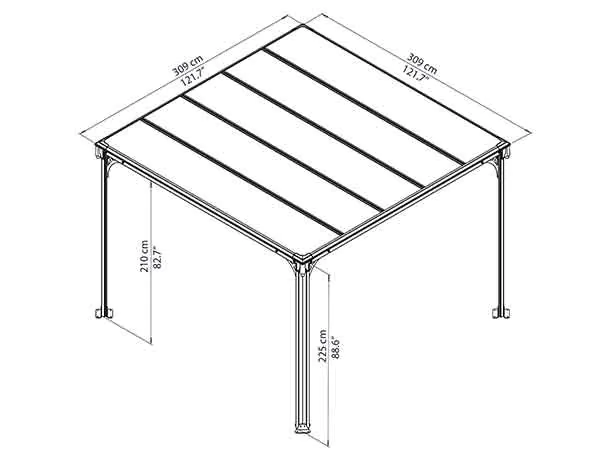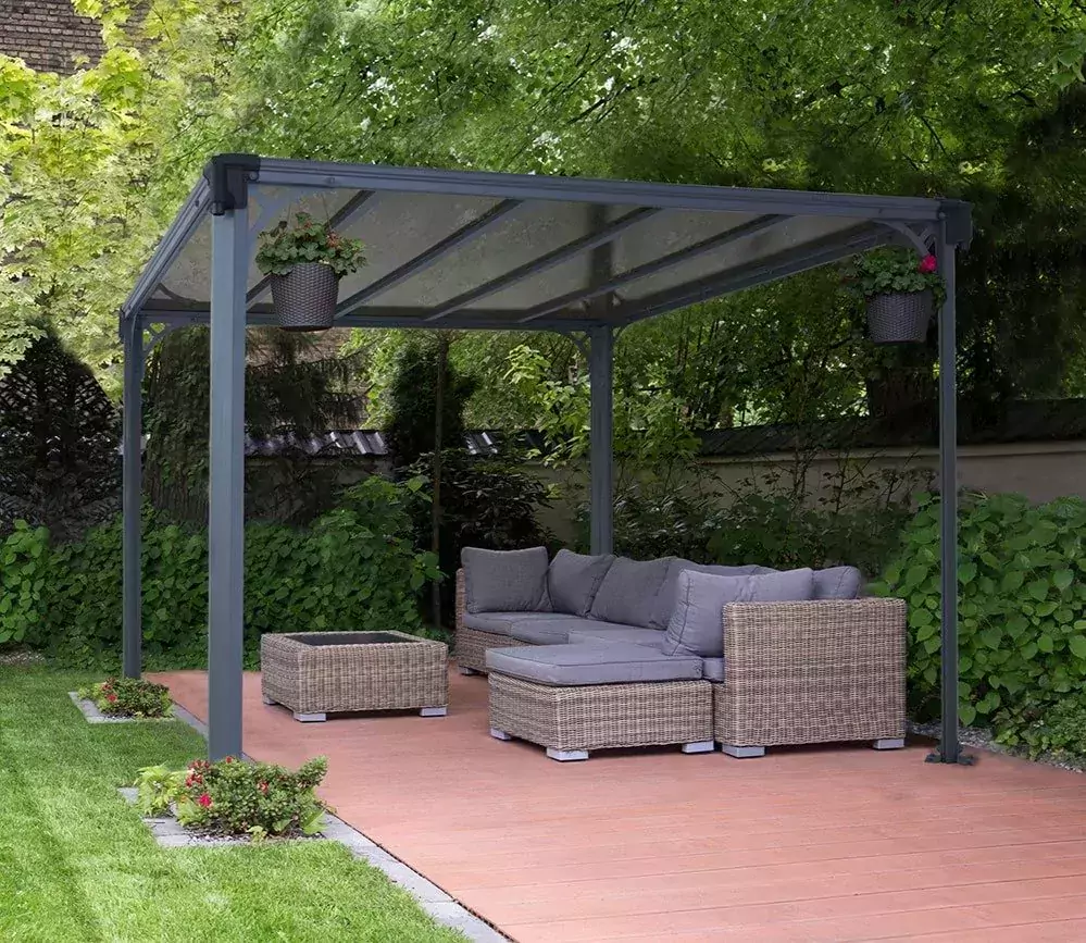 Robust, rust-resistant, granulated anthracite powder-coated frame made of heavy-duty aluminium and laser cut galvanized steel connectors; Virtually unbreakable, high impact 100% UV protected 6 mm twin-wall polycarbonate panels -protect from harmful UV rays, hail and snow.