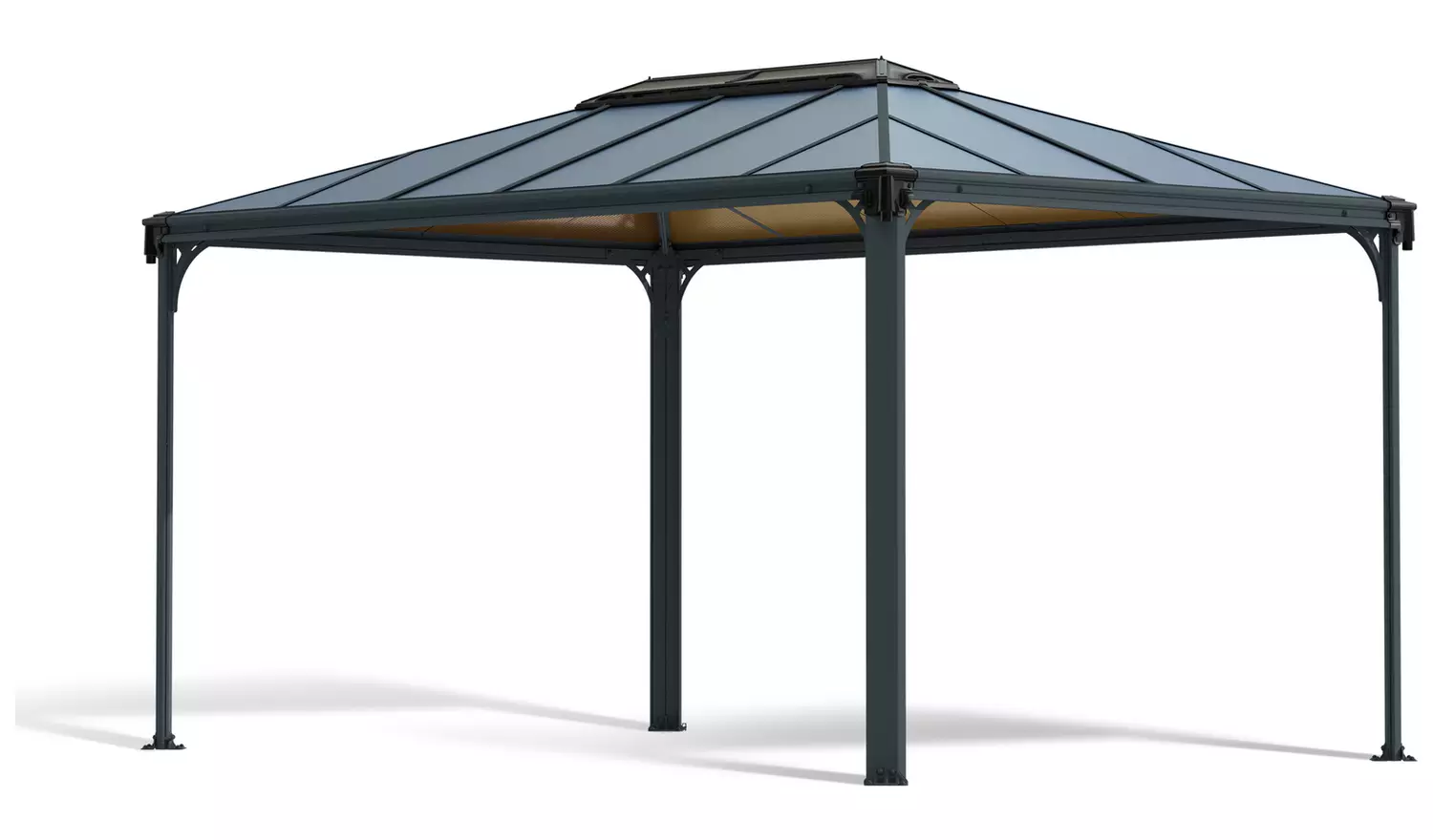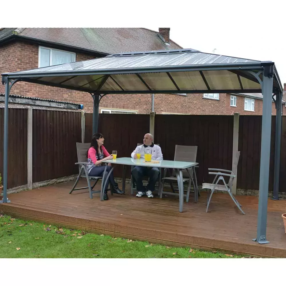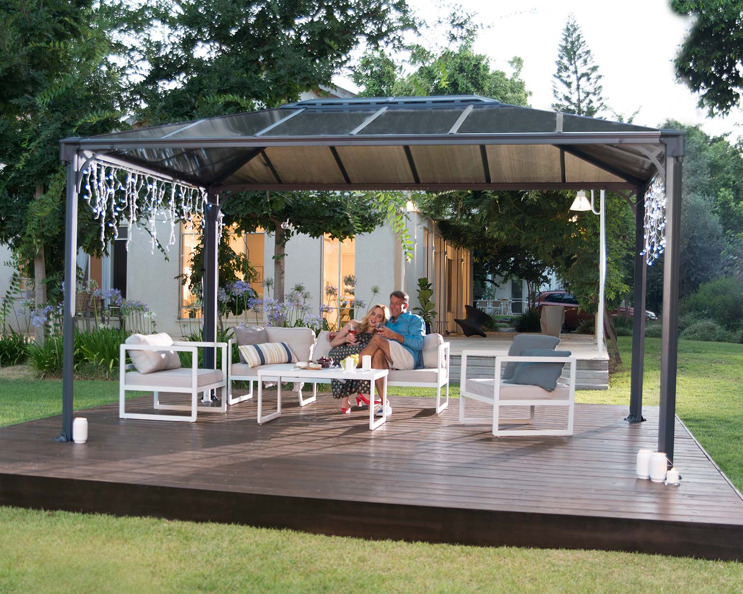 This gazebo is crafted to deliver elegance and utility to your garden year-round; it is sturdy and durable, comprised of anthracite powder coated structure, combined with virtually unbreakable twin-wall Polycarbonate roof panels, which protect your patio furniture from harsh weather conditions for many years of carefree enjoyment.
