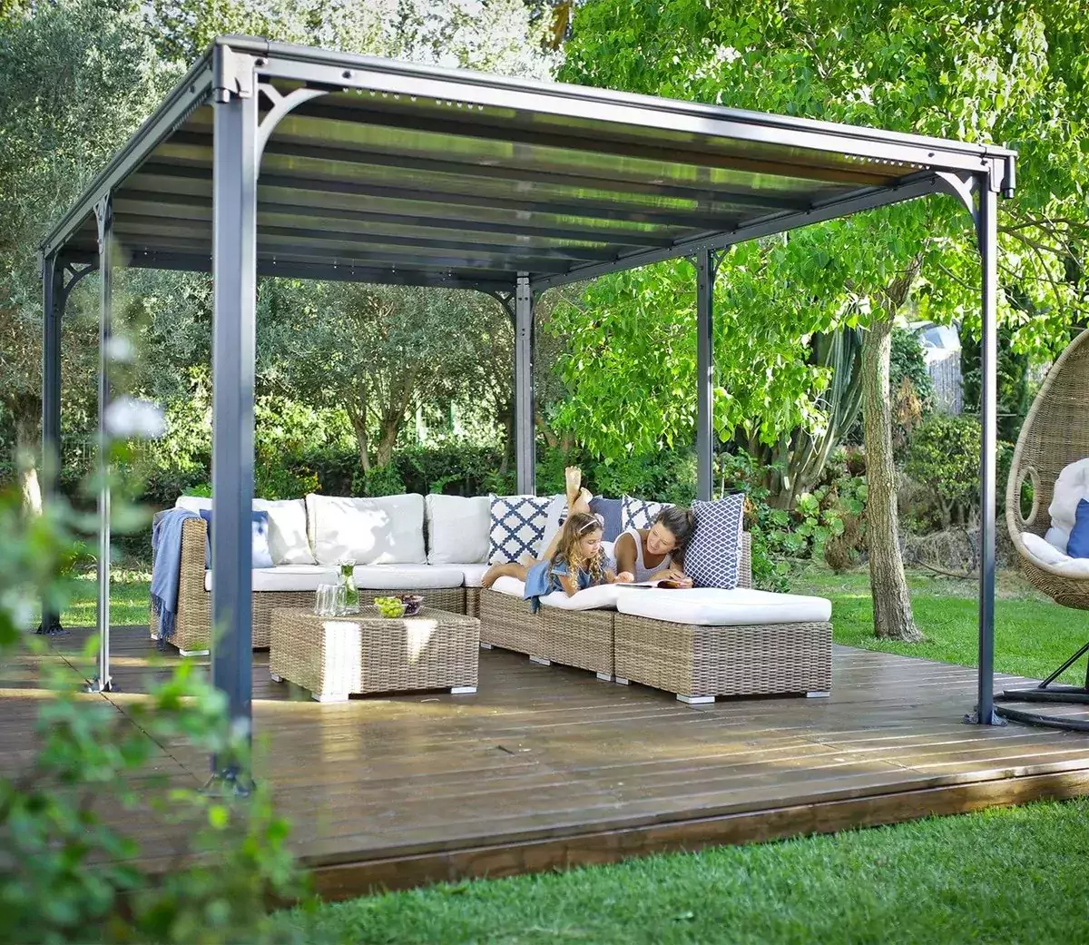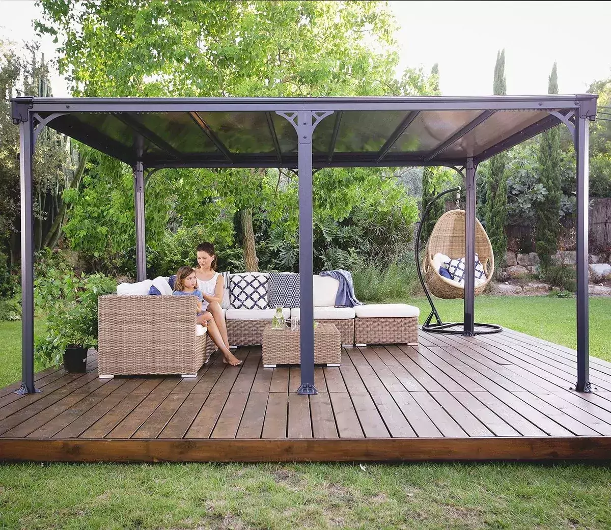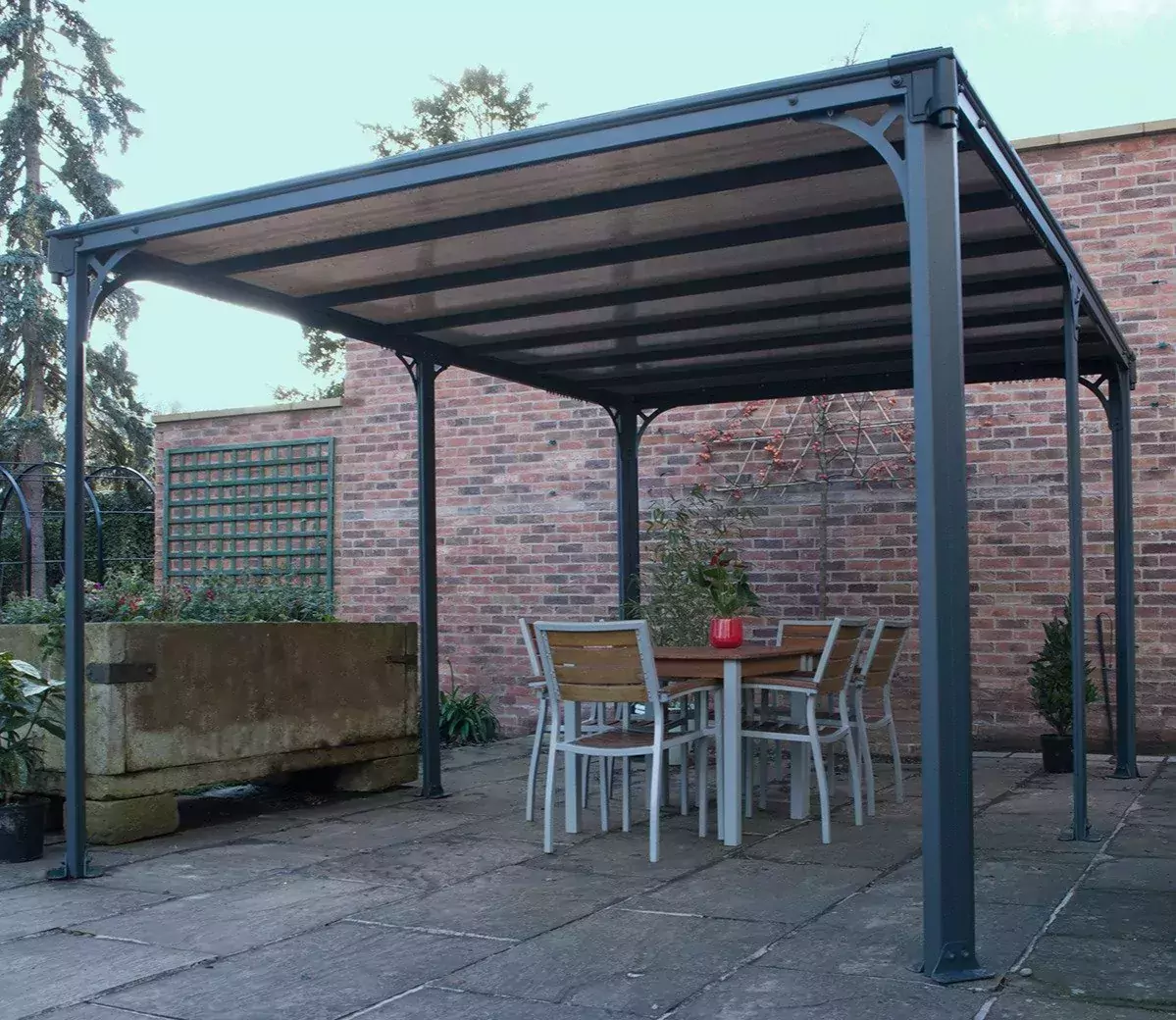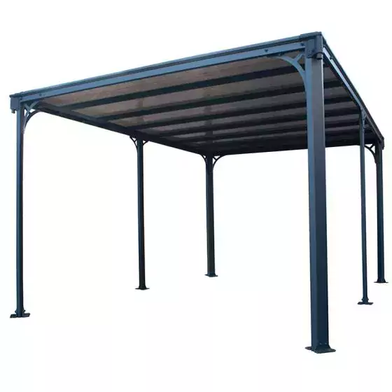 Robust, rust-resistant, granulated anthracite powder-coated frame made of heavy-duty aluminium and laser cut galvanized steel connectors; Virtually unbreakable, high impact 100% UV protected 6 mm twin-wall polycarbonate panels -protect from harmful UV rays, hail and snow.